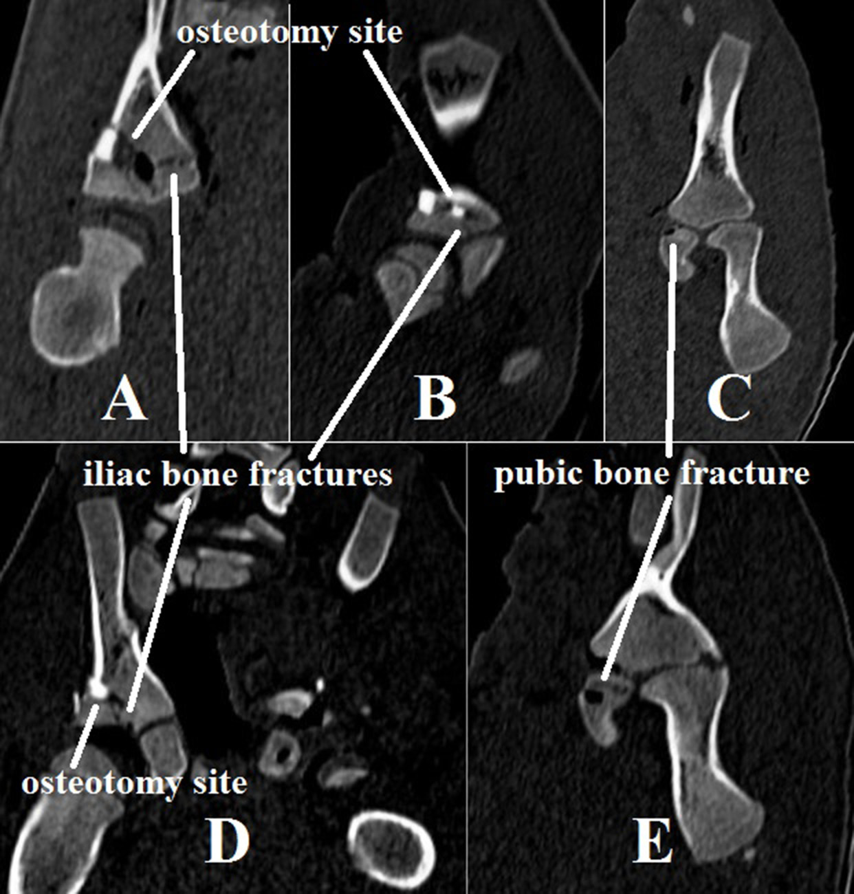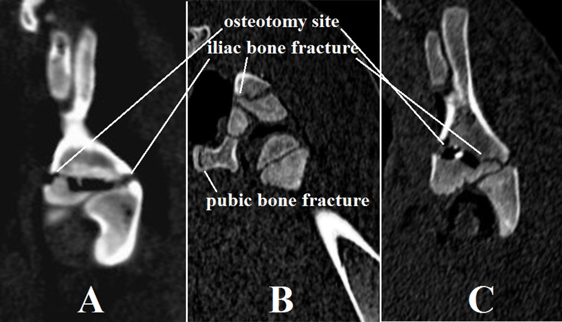 Results. No bone changes were found after Salter osteotomy in younger piglets, while contralateral pubic bone metaphyseal fractures were found in older animals. After Pemberton osteotomy, greenstick fractures in iliac and pubic bones metaphyses in the triradiate cartilage area were revealed in younger and older piglets. After Dega osteotomy, a posterior medial cortical layer fracture of the uncut iliac bone in the greater sciatic notch was found in all piglets. In older piglets, an additional hinge point was detected in the ipsilateral pubic bone metaphysis.