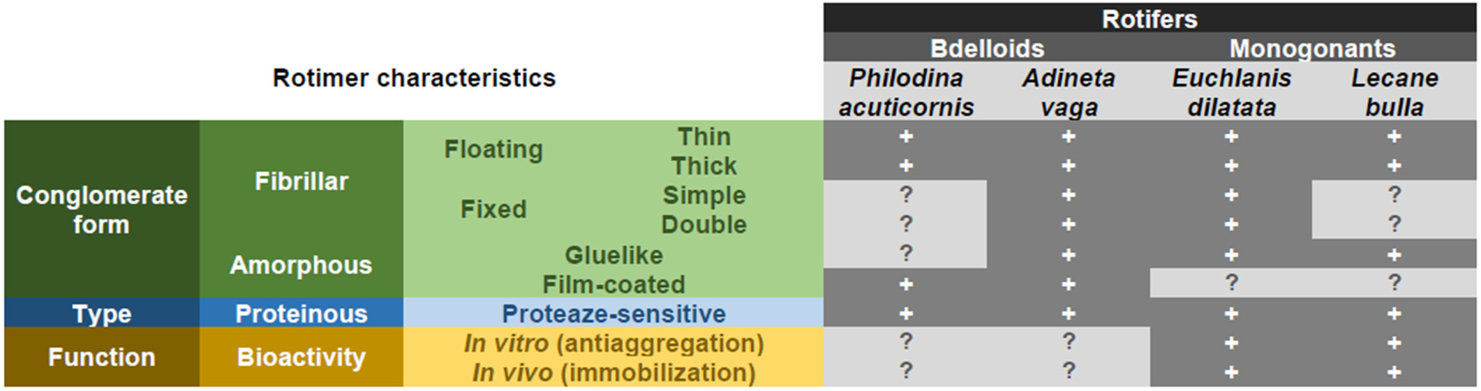 Based on the observation that many freshwater rotifer species can produce different Rotimers, it can be assumed that this biomaterial, a type of biopolymer, is phylogenetically formed and evolutionarily ancient (presumably more than 0.5 billion years old). This proteinous multifunctional macromolecule may be a key component of the abovementioned catabolic and neurotoxic aggregate inactivation capacity.33 Therefore, the aim of future research is to fully understand the different groups and types of Rotimers, and explore their molecular structure and possible translational and multifunctional applications. The related novel and interdisciplinary methodologies, the phenomenon of catabolism of aggregated proteins, the existence of Rotimers, and their pilot characterization were recently introduced. The research timeline and work on rotifers and their secretions have reached a stage from which forward movement can only happen after gaining knowledge on specific, holistic and molecular endpoints. Investigating the full range and potential applicability of Rotimer biomolecules can shed light on their species specificity, molecular composition and structure, and possible use as active substances. Moreover, these natural products can serve as a good starting point for amassing information about their artificial molecular design and medical applications. The full characterization of this new family of biopolymers provides an exceptional opportunity to launch new projects and to develop further application areas on countless lines. Based on the currently available data, it may be applied indirectly in chemistry (e.g., as a drug carrier) or externally in medicine (e.g., on the skin surface). These special Rotimer exudates are promising new biopolymers that may serve as raw materials for industrial production and more advanced applications, such as developing drug candidates in pharmacological research or translational medicine (e.g., regenerating tissue matrix or even as carriers of active substances).