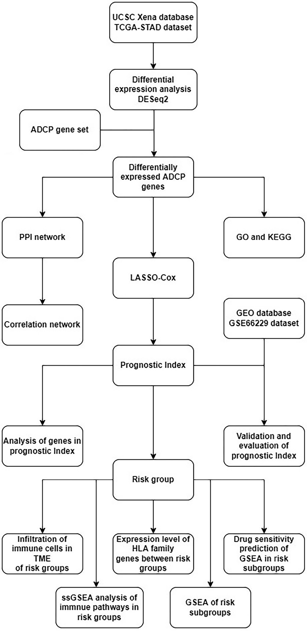 TCGA – The Cancer Genome Atlas; UCSC – University of California Santa Cruz; ADCP – antibody-dependent cellular phagocytosis; PPI – protein-protein interaction; LASSO – Least Absolute Shrinkage and Selection Operator; GEO – Gene Expression Omnibus; STAD – stomach adenocarcinoma; GO – Gene Ontology; KEGG – Kyoto Encyclopedia of Genes and Genomes; TME – tumor microenvironment; HLA – human leukocyte antigen; GSEA – Gene Set Enrichment Analysis; ssGSEA – single-sample Gene Set Enrichment Analysis.