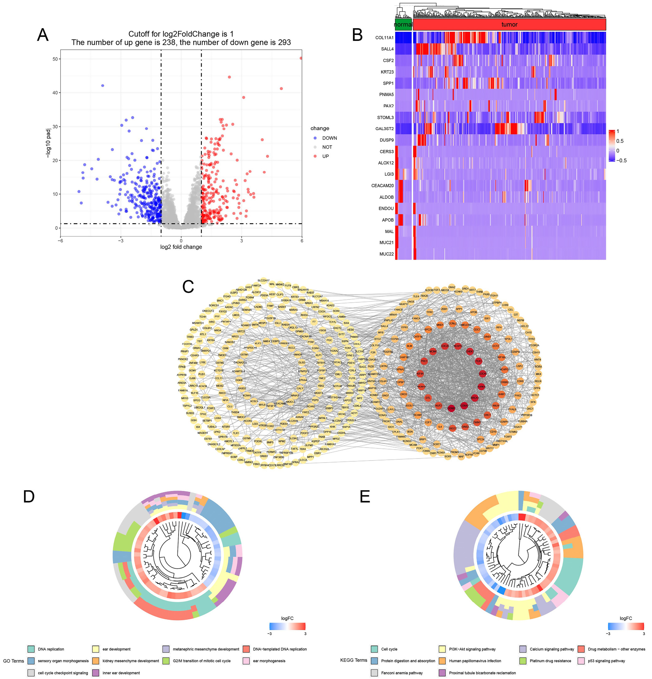 Fig. 2. Identification and characterization of differentially expressed ADCP-related genes. A. A volcano plot representing the 531 differentially expressed ADCP genes (238 of them were upregulated and 293 were downregulated) with a threshold of FDR less than 0.05 and a |log2FC| > 1; B. A heat map containing the 20 most significantly up-and downregulatedADCP genes between normal and tumor samples; C. The PPI network of 531 differentially expressed ADCP-related genes; D–E. GO (D) and KEGG (E) and analysis exploring the functions of the 531 genes