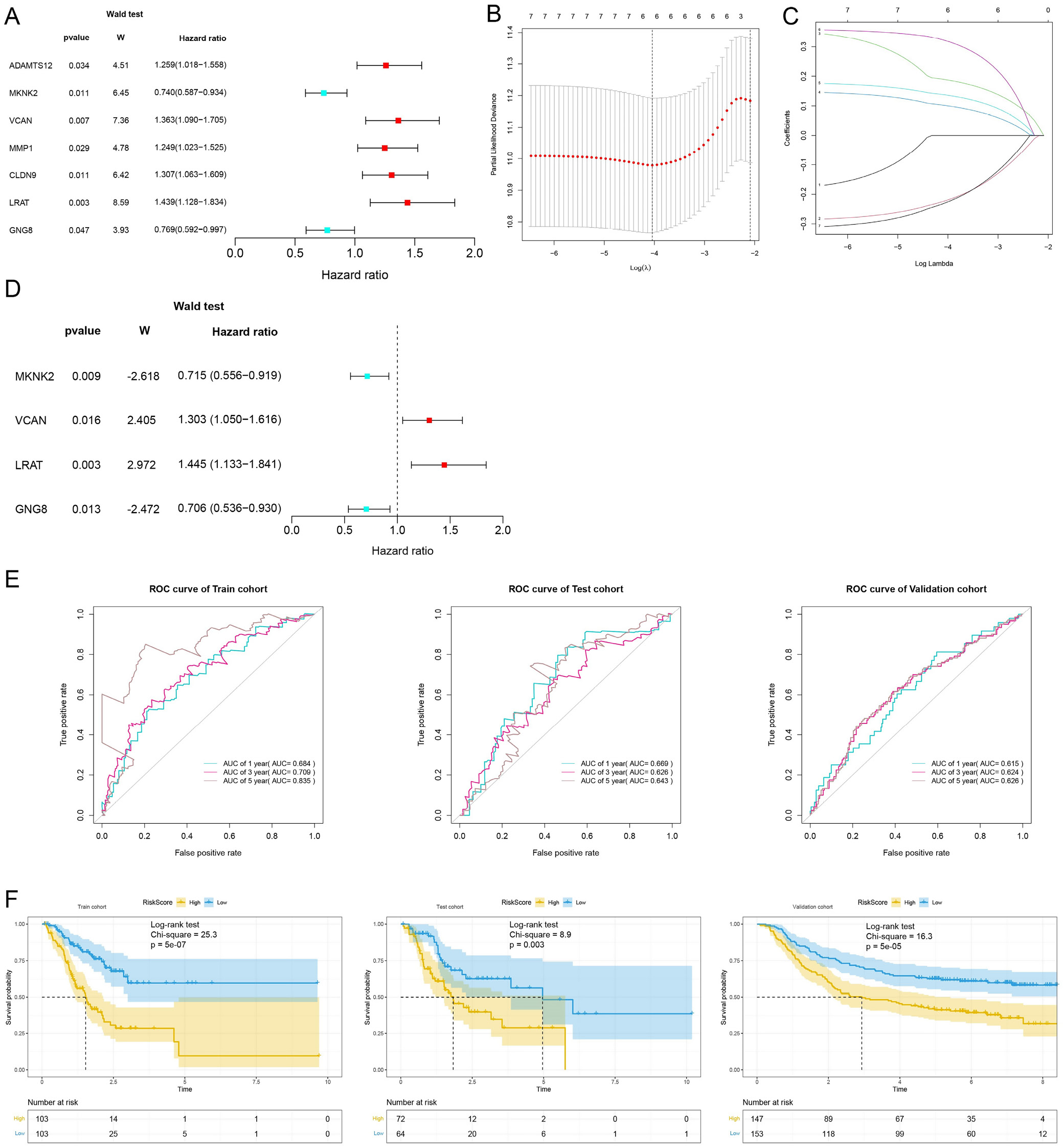 Fig. 3. Construction and validation of an ADCP-based signature. A. Univariate Cox regression analysis identified 7 ADCP-related genes with prognostic value (ADAMTS12, MKNK2, VCAN, MMP1, CLDN9, LRAT, and GNG8); B. Selection of the tuning parameter (λ) in the least absolute shrinkage and selection operator (LASSO) regression with a 10-fold cross-validation as the minimum criteria; C. LASSO coefficient profiles for clinical features and 6 non-zero coefficients were selected; D. Four genes (MKNK2, VCAN, LRAT, and GNG8) were selected by multivariate Cox regression analysis; E. Receiver operating characteristic (ROC) curves to display the 1-, 3- and 5-year area under the curve (AUC) in the train cohort, test cohort and validation cohort; F. Survival differences between low- and high-risk groups in the training cohort (log-rank test, p = 5e-07), test cohort (log-rank test, p = 0.003) and validation cohort (log-rank test, p = 5e-05)