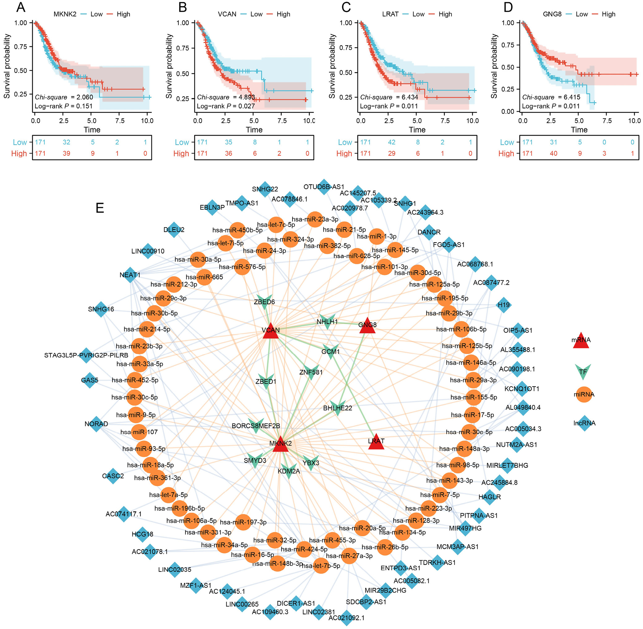 Fig. 4. Survival estimation and PPI network of the signature genes. A–D. Survival differences between low- and high-expression groups of MKNK2 (A) (log-rank test, p = 0.151), VCAN (B) (log-rank test, p = 0.027), LRAT (C) (log-rank test, p = 0.011) and GNG8 (D) (log-rank test, p = 0.011); E. ceRNA-TF network based on the selected genes, miRNAs, lncRNAs, and transcription factors
