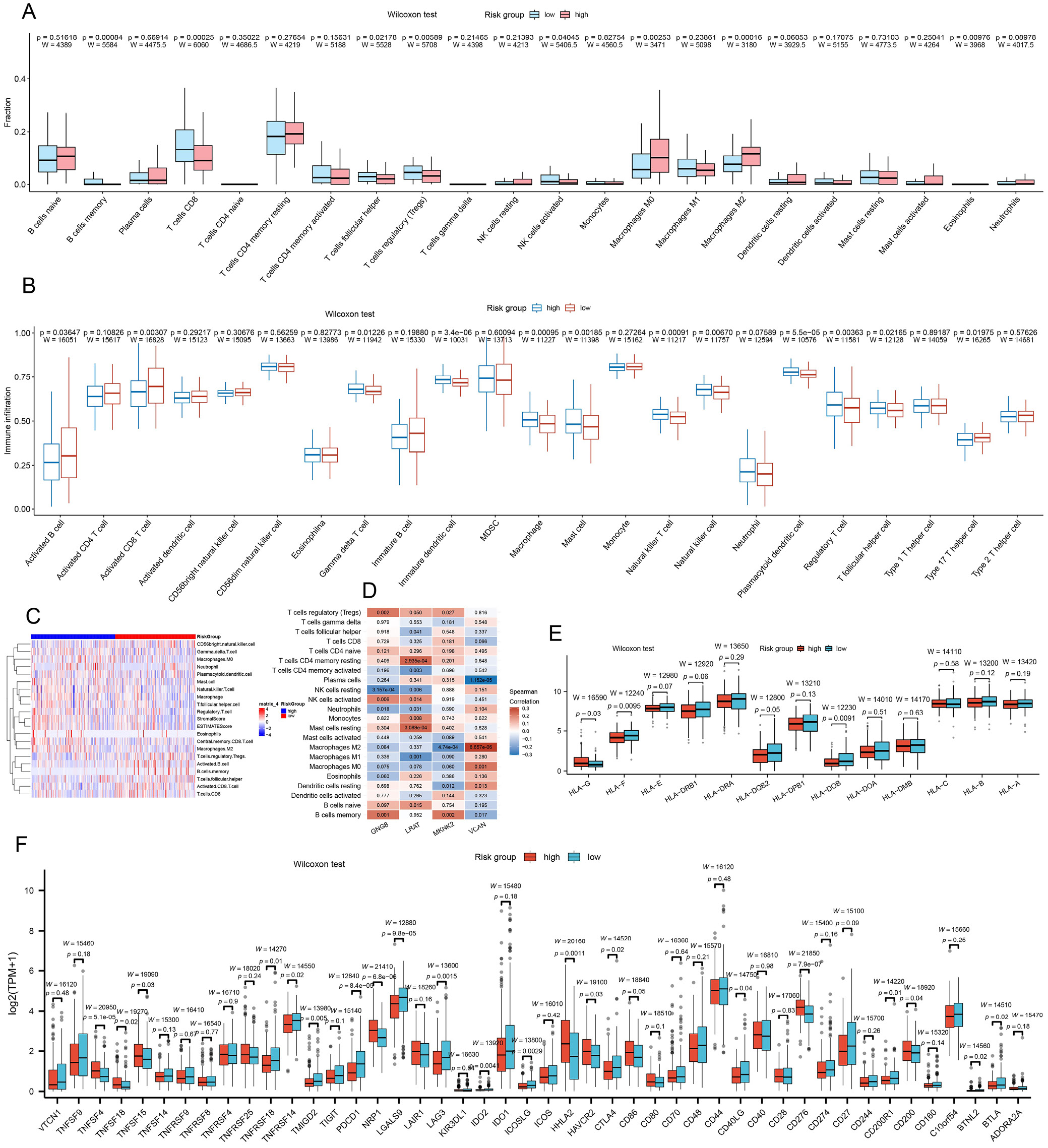 Fig. 5. Immune cell infiltration and immunomodulators of the ADCP-based signature. A,B. Differences in the abundance of immune cell infiltration in high- and low-risk groups using CIBERSORT (A) and ssGSEA (B) algorithms; C. Heat map of immune infiltration between high- and low-risk groups using the CIBERSORT and ESTIMATE algorithms; D. Heat map of the correlation between model genes and differential immune cells using CIBERSORT; E. Differences in the expression of HLA family genes between high- and low-risk groups; F. Differences in the expression of immune checkpoints between high- and low-risk groups