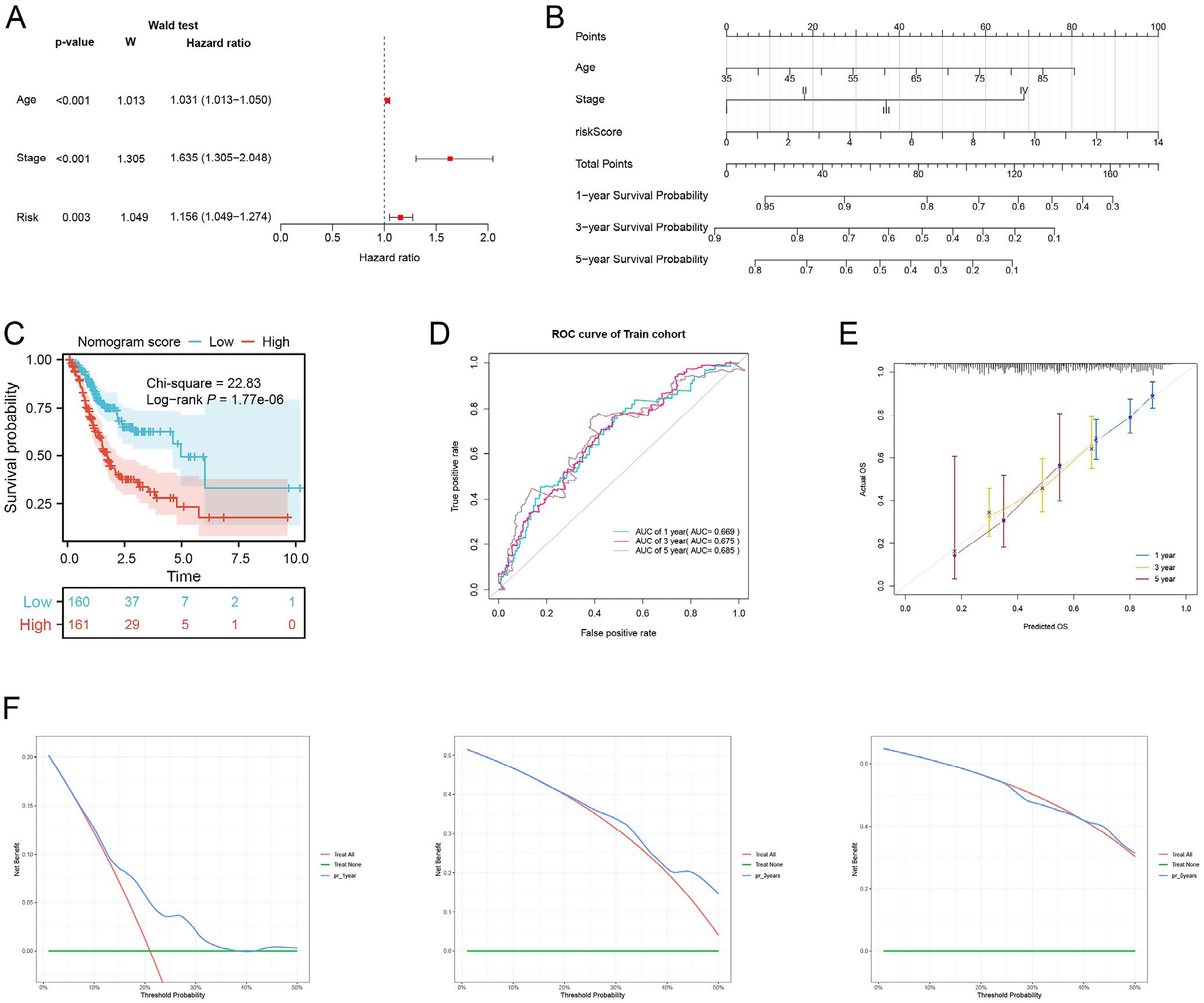 Fig. 8. Construction of nomogram. A. Multivariate Cox analysis revealed 3 independent prognostic factors (age, stage and risk score); B. A predictive nomogram based on age, stage and risk score; C. Overall survival estimation of nomogram score subgroups (log-rank test, p = 1.77e-06); D. ROC curves showed that the 1-, 3- and 5-year AUC reached 0.669, 0.675 and 0.685 in the TCGA train cohort, respectively; E. The 1-, 3- and 5-year calibration curves of the nomogram; F. The 1-, 3- and 5-year DCA decision curves of the nomogram.