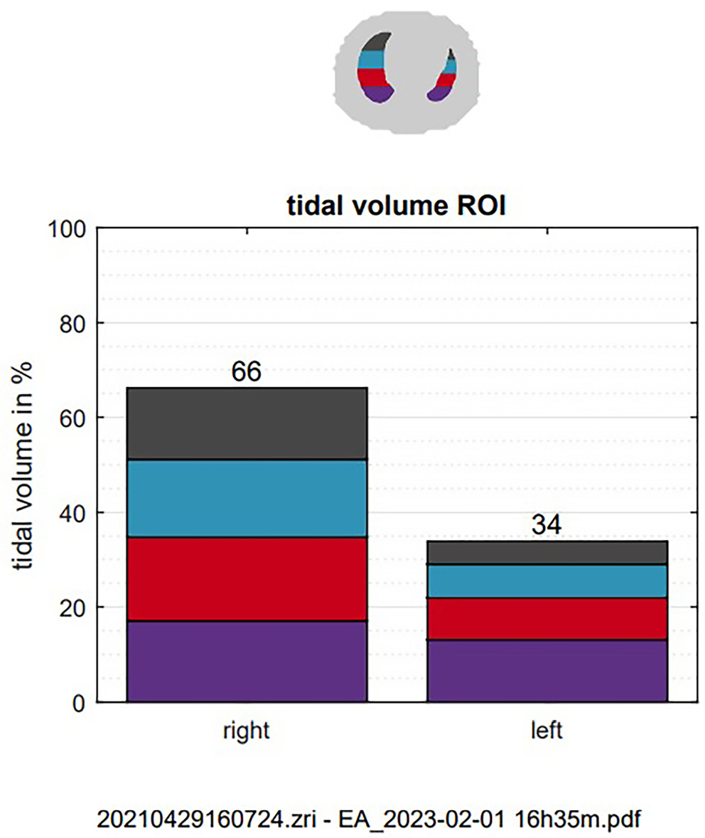 5. Distribution of tidal volume between the right and left lungs separately, referring to the sum of tidal volumes per lung and the regional distribution (ventral, dorsal, central-ventral, and central-dorsal segments).