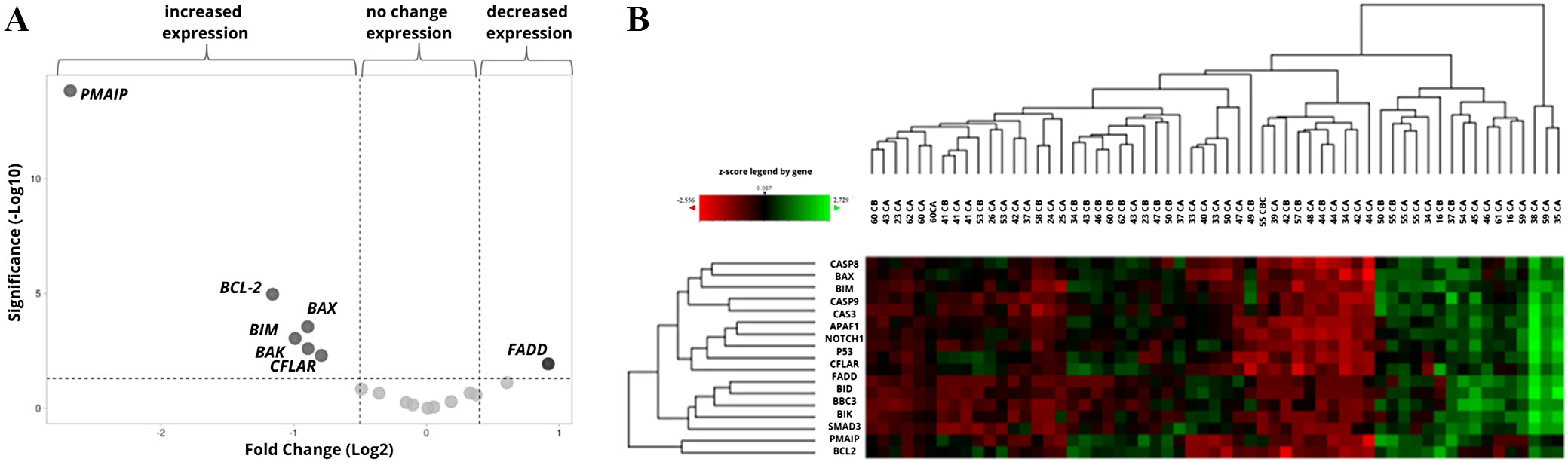 The influence of the culture conditions on the expression of the tested genes was determined with a control group. The cells were cultured for 48 h without the addition of drugs, and the final expression levels were compared to the initial values measured prior to culture (i.e., the reference values). The culture resulted in a significant decrease in PMAIP, BCL-2, BAX, BIM, BAK, and CFLAR gene expression, and an increase in the expression of FADD. Increase in BID gene (FC > 1.3) was not significant (Table 2, Figure 1A). Changes in the expression of the genes during the control culture in individual patients are shown on the heatmap with hierarchical clustering of samples (n = 59 including duplicates) and genes (n = 17) (Figure 1B).