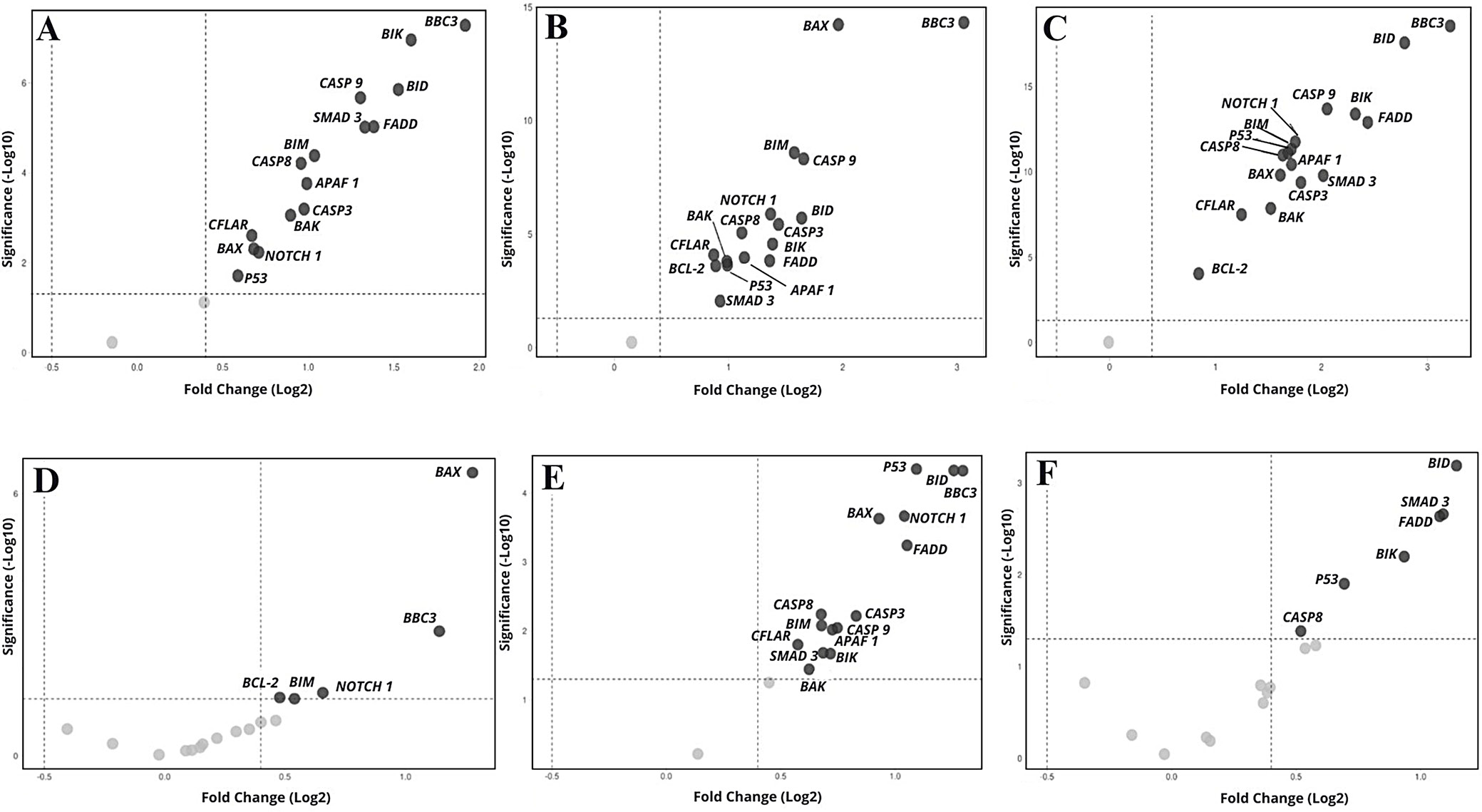 The increase was not significant for BAK (FC = 1.548; p = 0.055) and CFLAIR (FC = 1.369; p = 0.129). The addition of both drugs resulted in a significant increase in all genes compared to controls, except PMAIP (FC = 3.209; p = 0.975), which was insignificantly higher, and SMAD3 (FC = 0.994; p = 0.000) which did not differ (Figure 2C, Figure 3C).