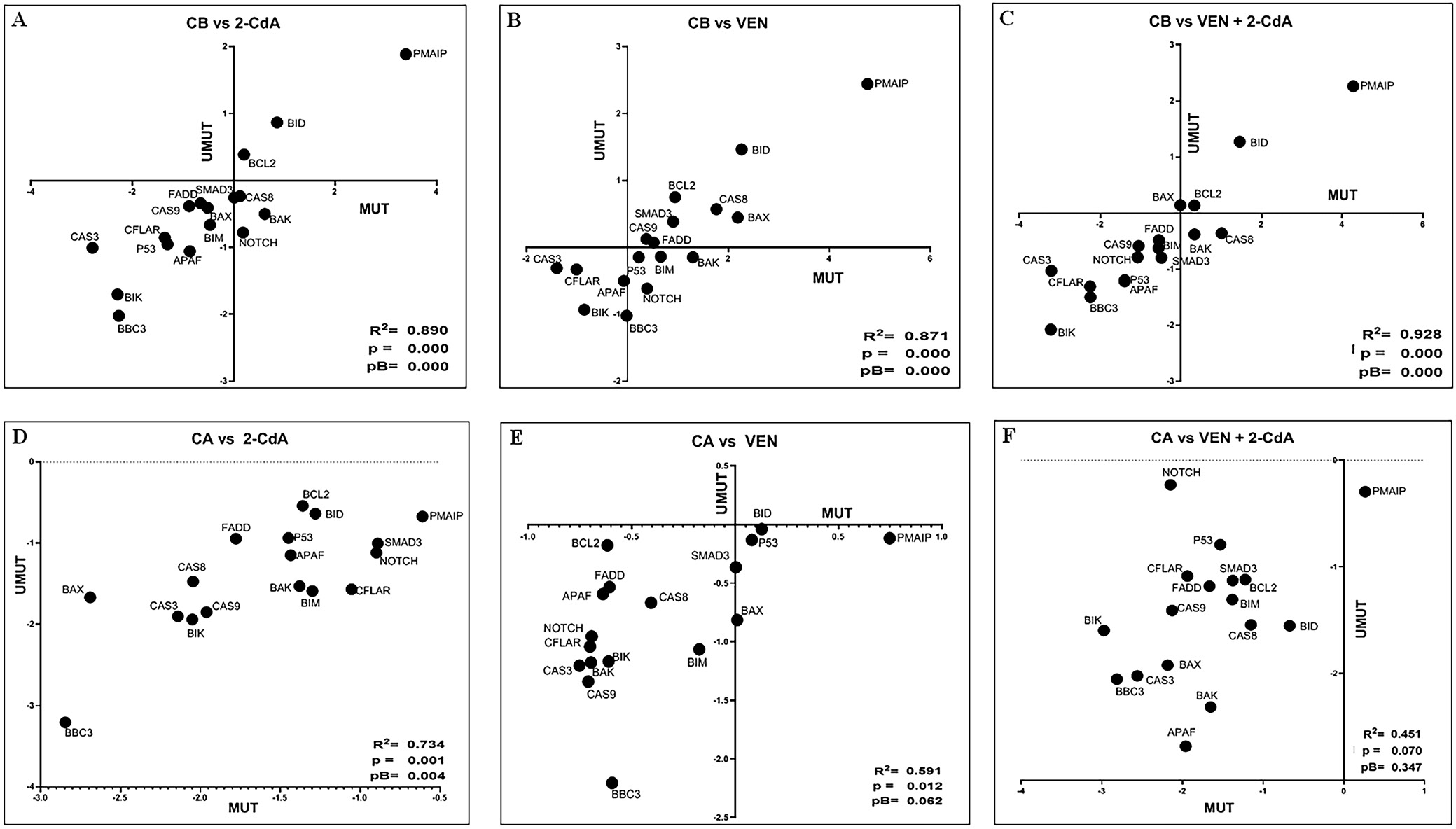 Unfortunately, it was not possible to perform any direct comparison between the changes in gene expression between patients with mutated compared to non-mutated IGVH. Therefore, a series of graphs was generated, with 1 for each experimental condition (drug/drug combinations) (Figure 5, Figure 6). On each graph 1 gene was represented by a dot having the coordinates: X axis: log(FC) for mutated cases; and Y axis: log(FC) for unmutated cases. Spearman’s correlation coefficient (r) was then calculated for each experimental condition.