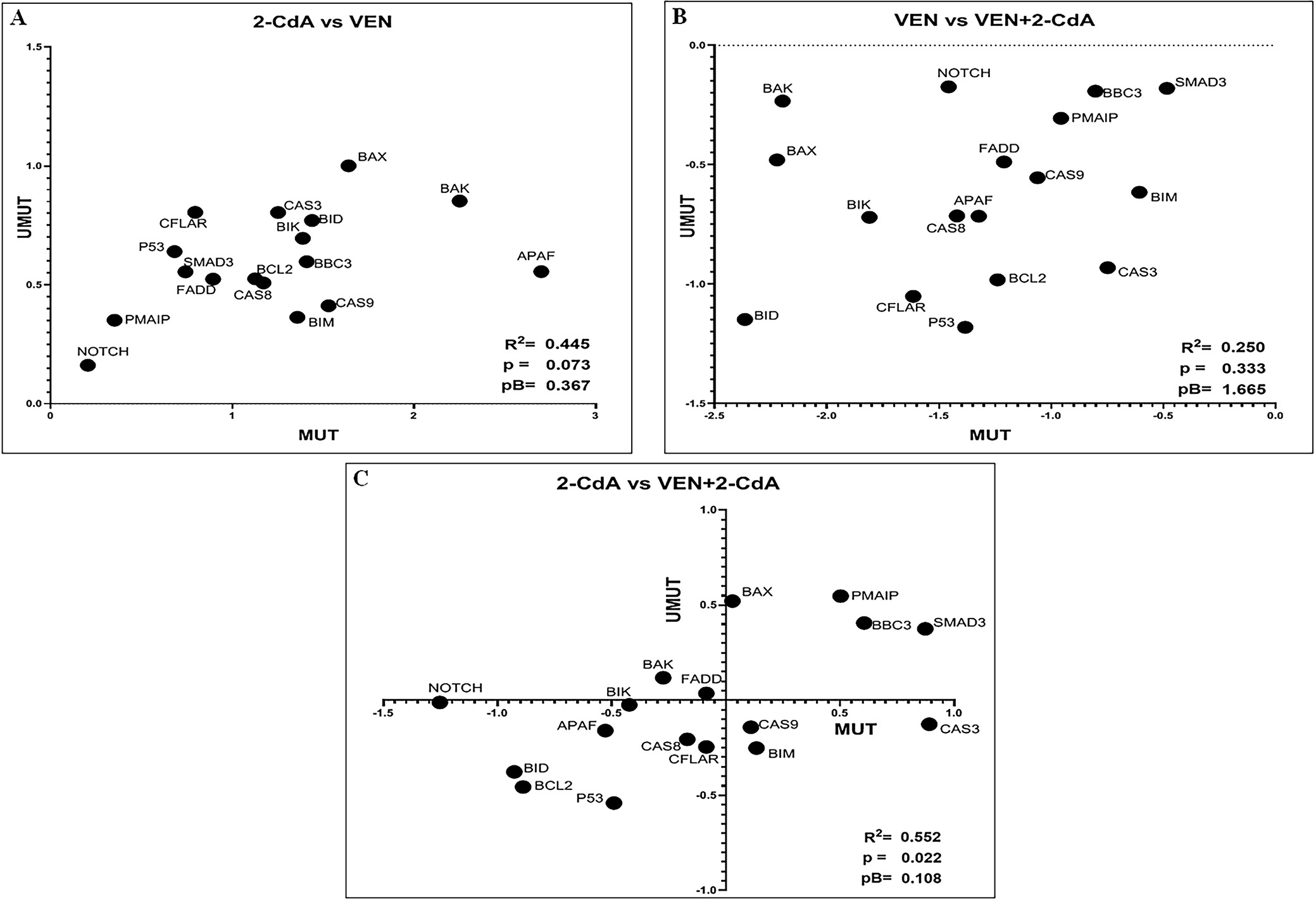 Results. Venetoclax + 2-CdA had a stronger effect on all tested genes except BCL2 and PMAIP compared to VEN alone, and on BID, BIK, FADD, P53, and SMAD3 compared to 2-CdA alone.