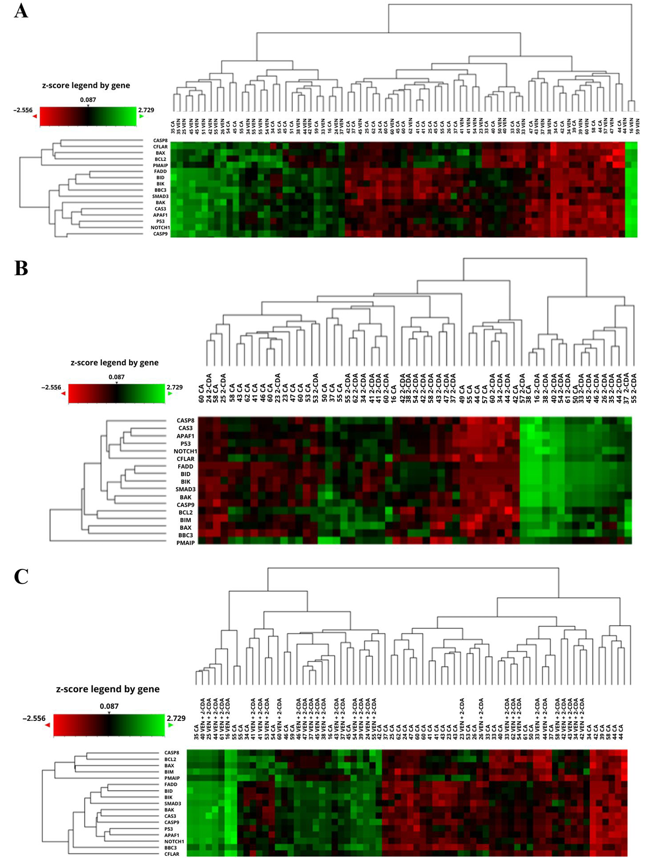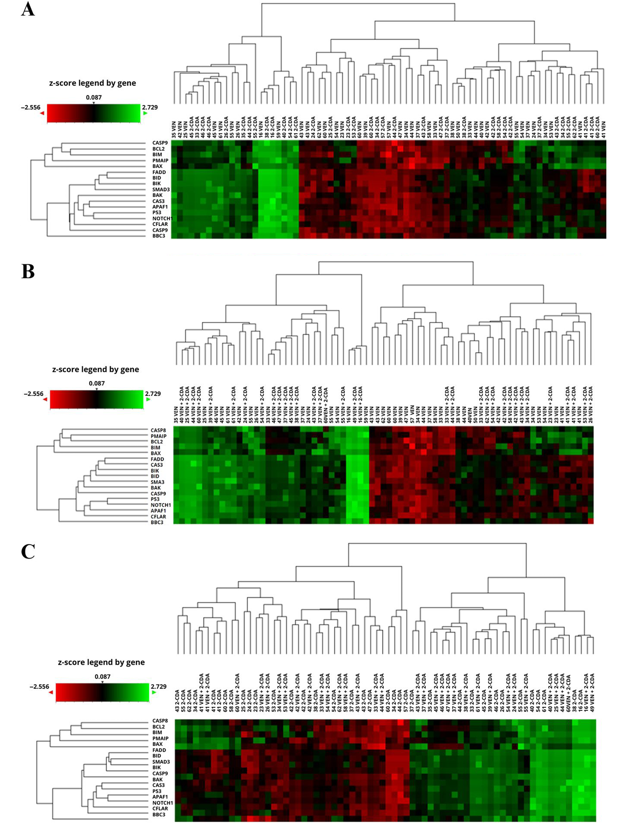In our previous study involving 103 treatment-naïve CLL patients,13 we found that VEN, 2-CdA and their combination exhibited cytotoxicity and the ability to induce apoptosis. In addition, VEN and 2-CdA appeared to act synergistically, leading to an increased proportion of cells expressing proteins involved in both the intrinsic (BAX, PUMA, BIM, NOXA) and extrinsic (FADD) apoptotic pathways. We also observed a decrease of BCL-2 and increase of TP53 expression under the action of both drugs alone and in combination. To further investigate the mechanisms of action of VEN, 2-CdA and their combination on CLL cells, the present study examines their effects on a panel of genes known to be involved in the apoptosis of peripheral blood lymphocytes, using samples from 40 patients included in the previous study.13 The influence of VEN and 2-CdA alone and in combination on the expression of these genes was tested. We analyzed the genes encoding the proteins analyzed in the previous study, as well as 7 others encoding other factors playing a part in apoptosis. Thus, the present analysis included genes encoding the proteins positively involved in intrinsic (BAX, BBC3, BIM, P53, APAF-1, BAK, BID, BIK, caspase-3 and -9, PMAIP, SMAD3) and extrinsic (caspase-8 and FADD) pathways of apoptosis, as well as having antiapoptotic activity (BCL2, CFLAIR, NOTCH-1).