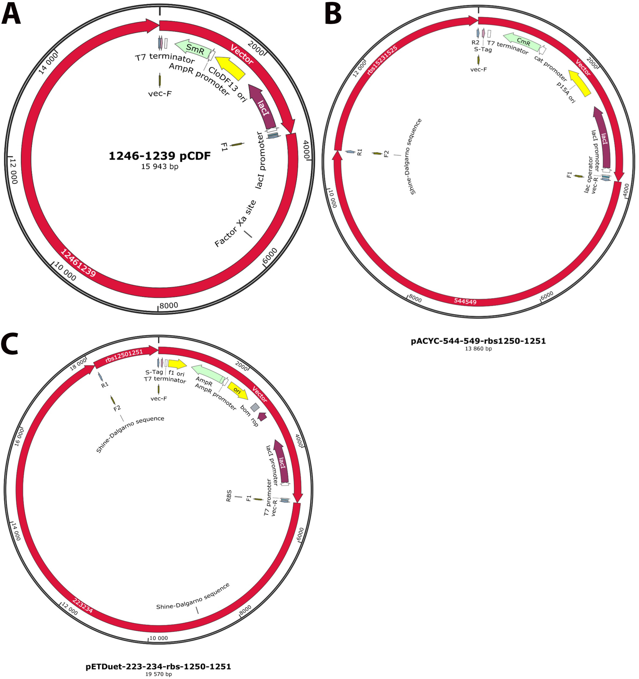 Plasmids pACYCDuet-1, pETDuet-1, pRSFDuet-1, and pCDFDuet-1 with cloned inserts were transformed into BL21(DE3) chemically competent cells according to the manufacturer’s instructions. Clones were selected on Luria–Bertani or Miller–Hinton agar plates supplemented with chloramphenicol (25 µg/mL), ampicillin (50 µg/mL), kanamycin (50 g/µmL), and spectinomycin (50 µg/mL).