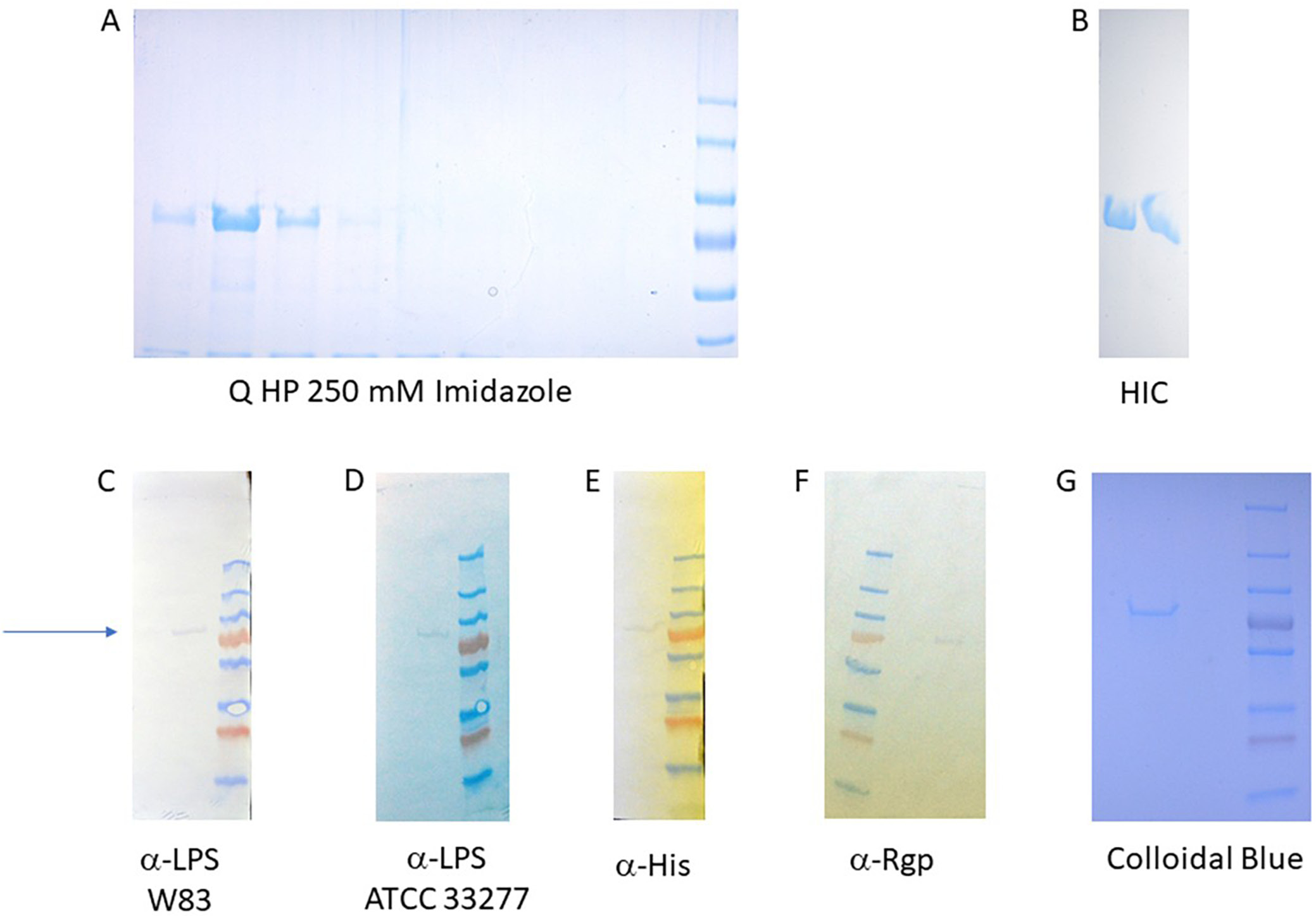 Final protein purity was assessed with SDS-PAGE using the Colloidal Blue Staining Kit (Life Technologies sp. z o.o.). The purified protein exceeded 99% purity (Figure 4A, G) and displayed an apparent molecular weight of approx. 70 kDa (Figure 4G). It was also successfully derivatized with the O-antigen from P. gingivalis strains W83 (Figure 4C) and ATCC 33277 (Figure 4D), and incorporated the fused pI antigen (Figure 4F).