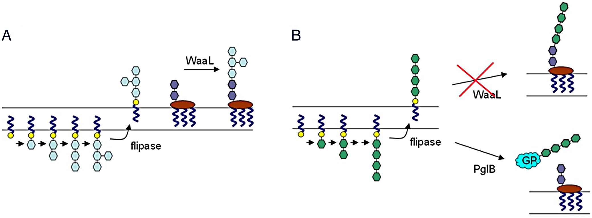An alternative strategy to couple carbohydrate antigens to peptide or protein is based on the utilization of Campylobacter jejuni undecaprenyl-diphosphooligosaccharide-protein-glycotransferase (PglB) glycosyltransferase.34 The enzyme catalyzes carbohydrate transfer to the side-chain amide of Asparagine (Asn) in the recipient peptide with a defined acceptor sequence D/E-X-N-X-S/T. The transfer process is relatively inefficient, and numerous studies have been conducted to improve its efficiency. Finally, a double mutant (RR → DL) in the original PglB sequence was identified, exhibiting broad transfer specificity for the Asp-Tyr-Asn-Ala-Thr (DYNAT) acceptor sequence.35, 36 The final step involved removing the competing O-antigen ligase (WaaL in E. coli) to eliminate the native pathway responsible for transferring the host-synthesized O-antigen to the lipid core. This strategy has been successfully demonstrated using the Burkholderia mallei O-antigen to create a recombinant vaccine covalently linked to a protein.37 Additionally, N-glycan transfer-based technology has been applied in the development of other vaccines.38, 39, 40