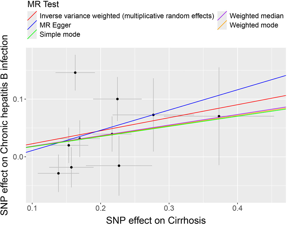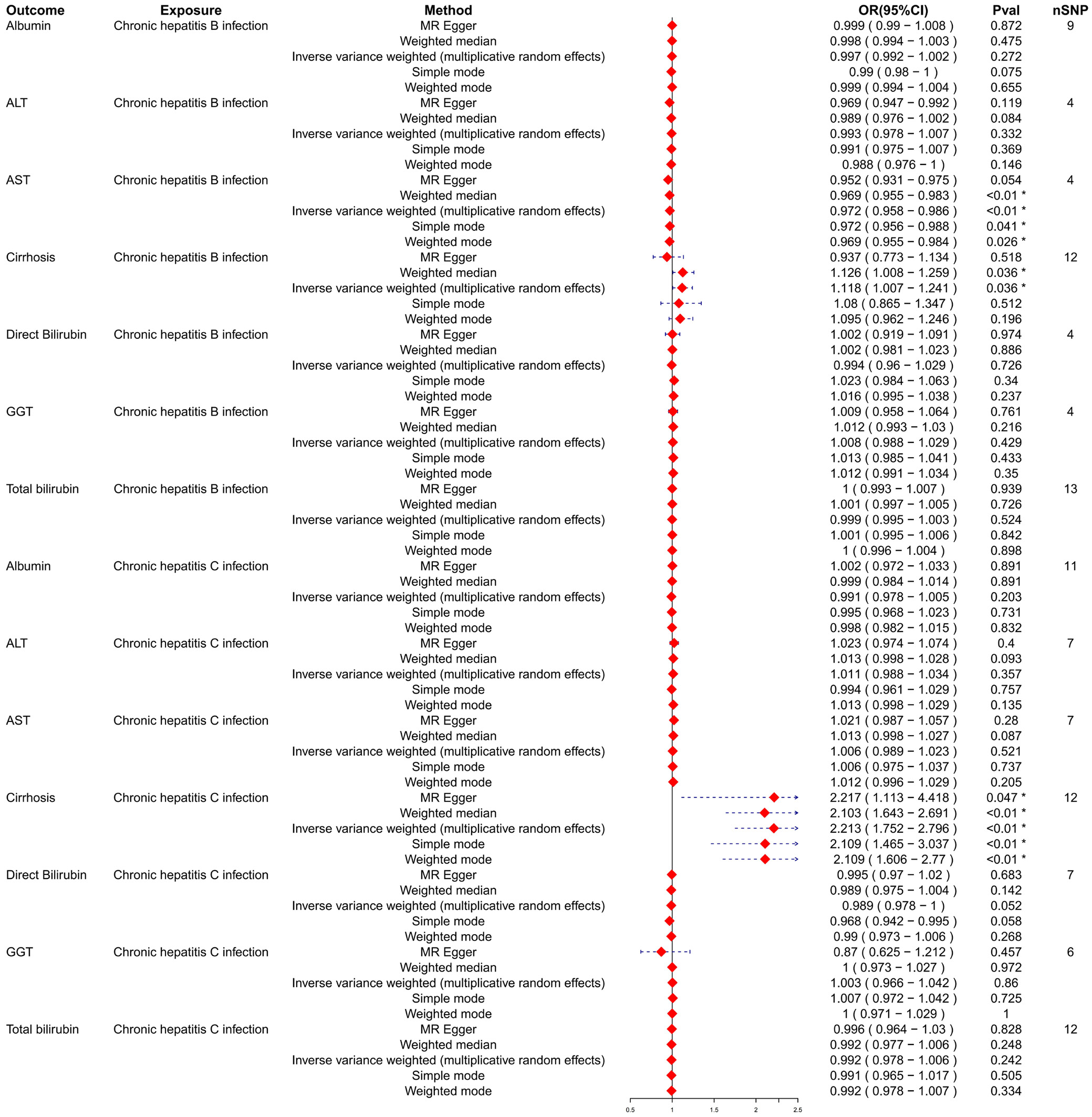 Results. The MR analysis revealed potential causal relationships between cirrhosis and HBV infection, indicating an increased probability of HBV as cirrhosis escalates (odds ratio (OR) = 1.253; 95% confidence interval (95% CI): 1.037–1.514; p = 0.019). Additionally, a potential causal link was observed between HBV and the level of aspartate aminotransferase (AST), with an increase in HBV leading to a gradual decrease in AST levels (OR = 0.972; 95% CI: 0.958–0.986; p < 0.01). A similar causal relationship was identified between HCV infection and cirrhosis, where the probability of cirrhosis significantly increases with rising HCV levels (OR = 2.213; 95% CI: 1.752–2.796; p < 0.01). The results demonstrated no pleiotropy or heterogeneity within the analysis.