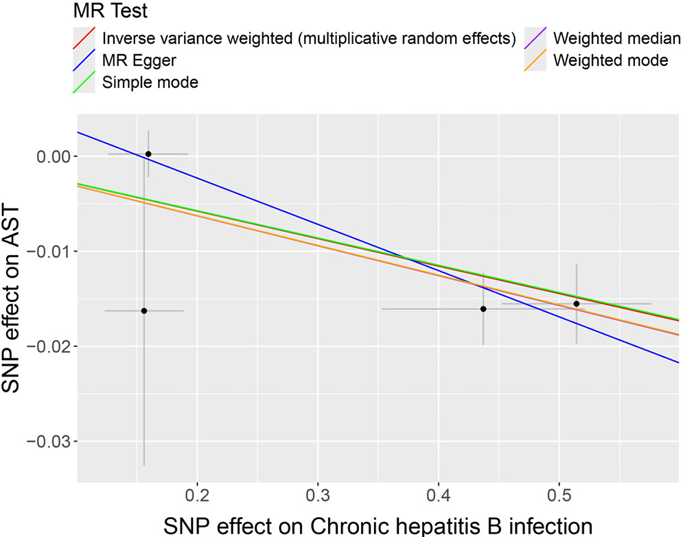 Subsequently, HBV and HCV were considered as exposures, with cirrhosis and liver biomarkers as outcomes, to conduct a reverse MR analysis. This approach further examined the causal relationships between HBV, HCV, cirrhosis, and liver biomarkers. Variants demonstrating pleiotropic effects were meticulously identified and subsequently excluded to ensure the integrity and accuracy of the causal inference. The results indicated a potential causal relationship between HBV and AST, with significant findings from the IVW model (OR = 0.972; 95% CI: 0.958–0.986; p < 0.01; Figure 3). The trends observed in MR-Egger, IVW and weighted median analyses were consistent and negatively correlated, suggesting HBV acts as a potential protective factor for AST levels, with an increasing probability of reduced AST levels as HBV increases (Figure 4). Similarly, a potential causal relationship was found between HCV and cirrhosis, with significant results from the IVW model (OR = 2.213; 95% CI: 1.752–2.796; p < 0.01; Figure 3) and consistent trends across MR-Egger, IVW and weighted median analyses, indicating a positive correlation (Figure 5). An OR greater than 1 suggests that HCV is a potential risk factor for cirrhosis, with an increasing probability of cirrhosis as HCV levels rise.