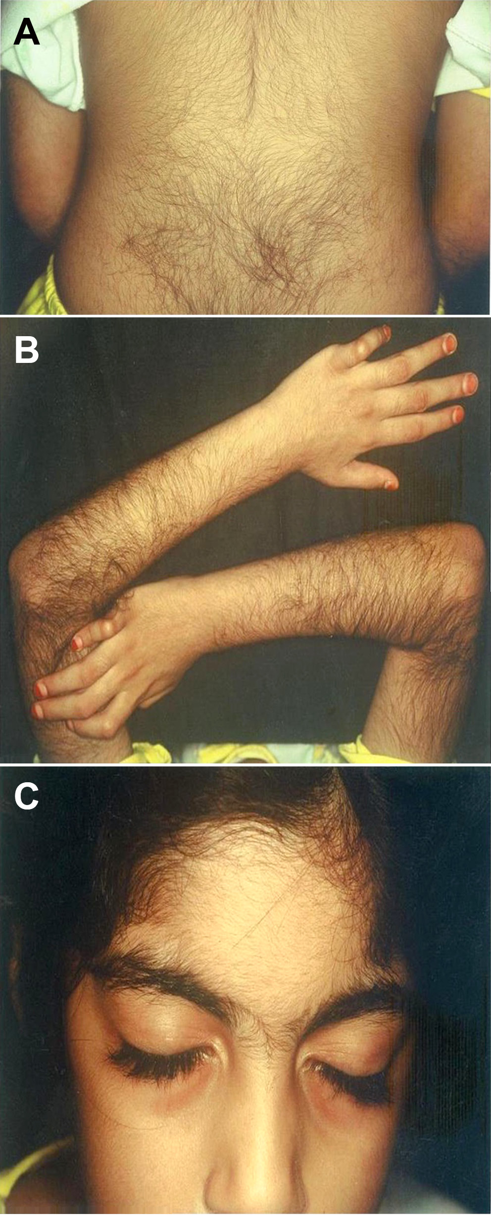 A 6-year-old female patients presented with characteristic facial features, including synophrys and long eyelashes, accompanied by generalized hypertrichosis. The patient showed a low anterior hairline with thick, dark hair and distinctive facial features, including arched eyebrows that met in the midline (synophrys). Generalized hypertrichosis was noted, particularly prominent on the back and extremities. Initial dermatological examination led to suspicion of CdLS, which was subsequently confirmed through genetic testing. This case illustrates how recognition of characteristic dermatological features can facilitate early diagnosis of CdLS.