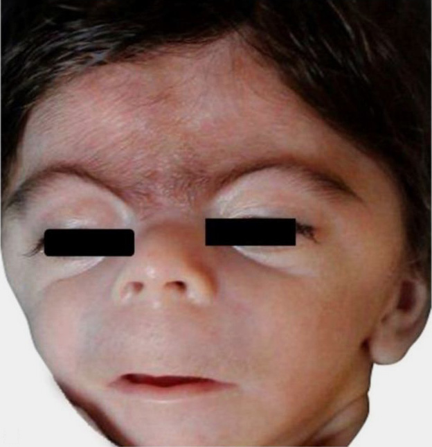 Cornelia de Lange syndrome tends to be associated with dark hair and eyebrows due to a disturbance in hair pigmentation (Figure 2). However, there has been no evidence of pigmentation disorders in the skin or eyes.21, 22
