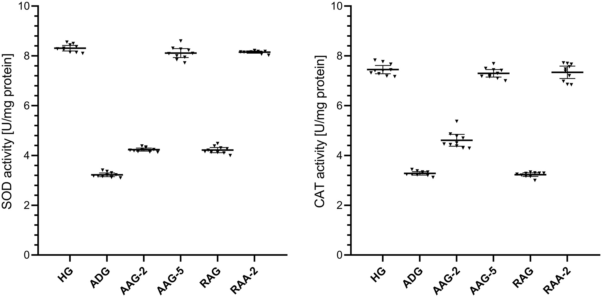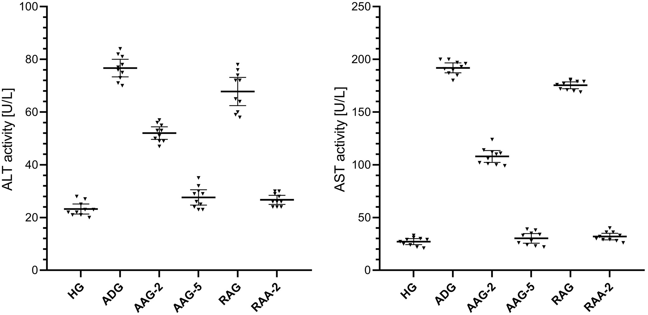 As shown in Figure 3 and Table 1, Table 2, the activity of AST in the blood serum was higher in the group treated with amiodarone than in the HG group. The difference in serum AST activities between the HG and the amiodarone treatment group was statistically significant. In addition, treatment with ATP 2 mg/kg, ATP 5 mg/kg, resveratrol and resveratrol + ATP 2 mg/kg significantly suppressed the amiodarone-induced increase in serum AST activity. In the groups treated with ATP 2 mg/kg and resveratrol, a statistically significant difference in blood serum AST activity was observed compared to the HG group. However, the difference in AST activity between the HG and the ATP 5 mg/kg and resveratrol + ATP 2 mg/kg treatment groups was not statistically significant.