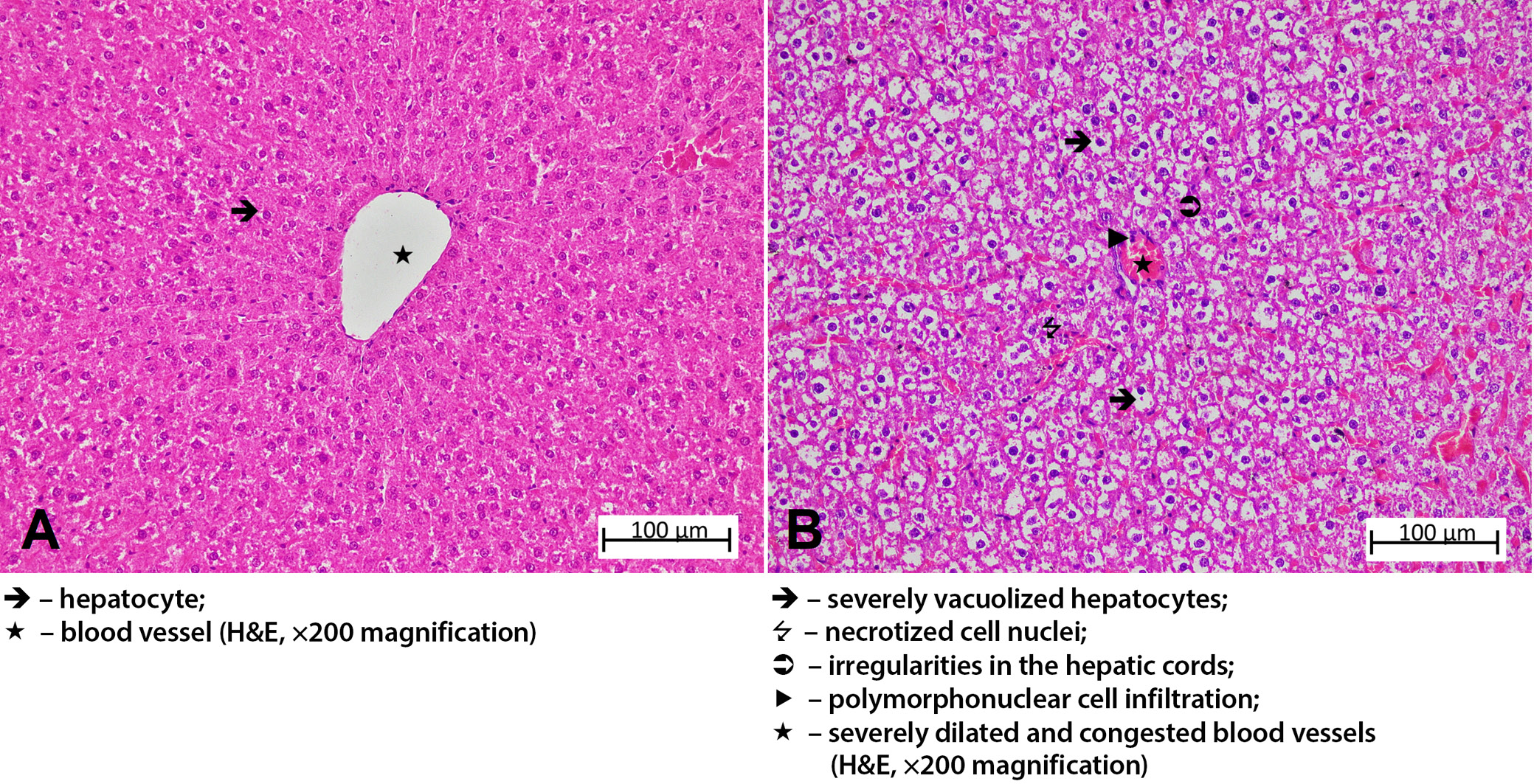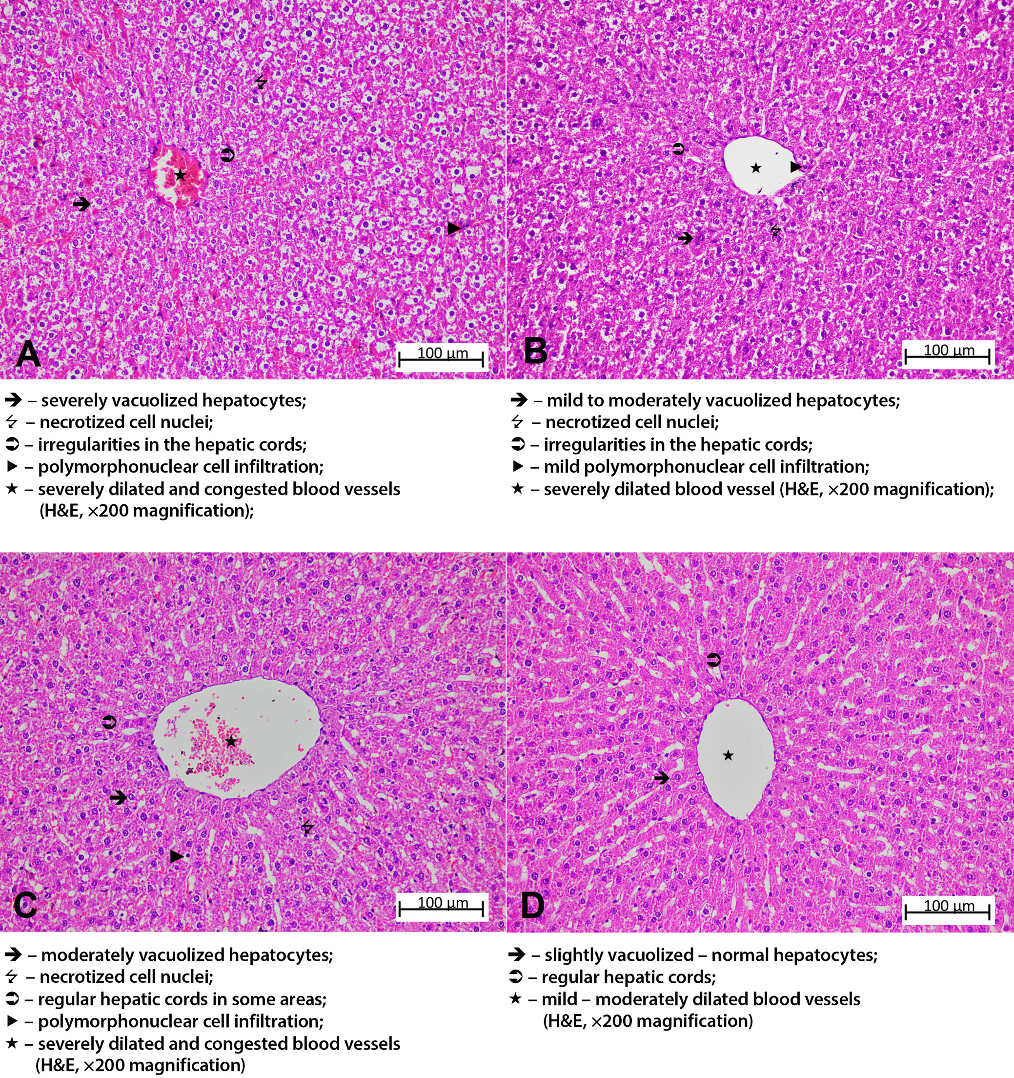 Tissue samples were fixed in 10% formaldehyde solution for 72 h. After fixation, the tissues were placed in cassettes and rinsed under running water for 24 h. They were then dehydrated by passing through a series of increasing degrees of alcohol (70%, 80%, 90%, and 100%). The xylol-transparent liver tissues were embedded in paraffin blocks, and 4–5-μm-thick sections were taken. The sections were stained with hematoxylin and eosin (H&E) double stain and evaluated and photographed using the Olympus DP2-SAL firmware program (Olympus Corp., Tokyo, Japan). In the serial sections obtained, six areas (1 central and 5 peripheral) were selected per section for each experimental group. At a ×100 magnification, deviations from normal histological structure were scored based on hepatocyte vacuolization, necrosis, vascular dilatation/congestion, and polymorphonuclear leukocyte (PMNL) infiltration. Each of the above criteria was scored on a scale from 0 to 3 (0 – none, 1 – mild, 2 – moderate, 3 – severe). Histopathological evaluations were performed by a histologist who was blinded to the experimental group assignments.