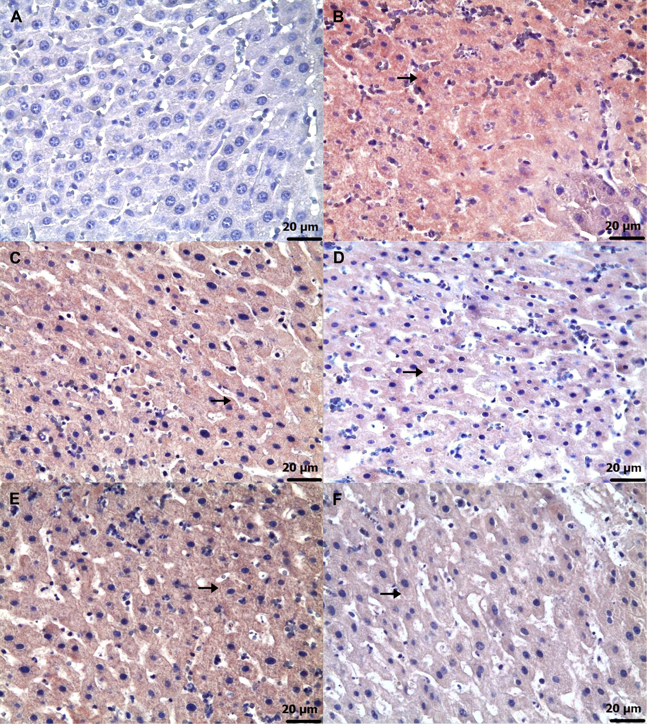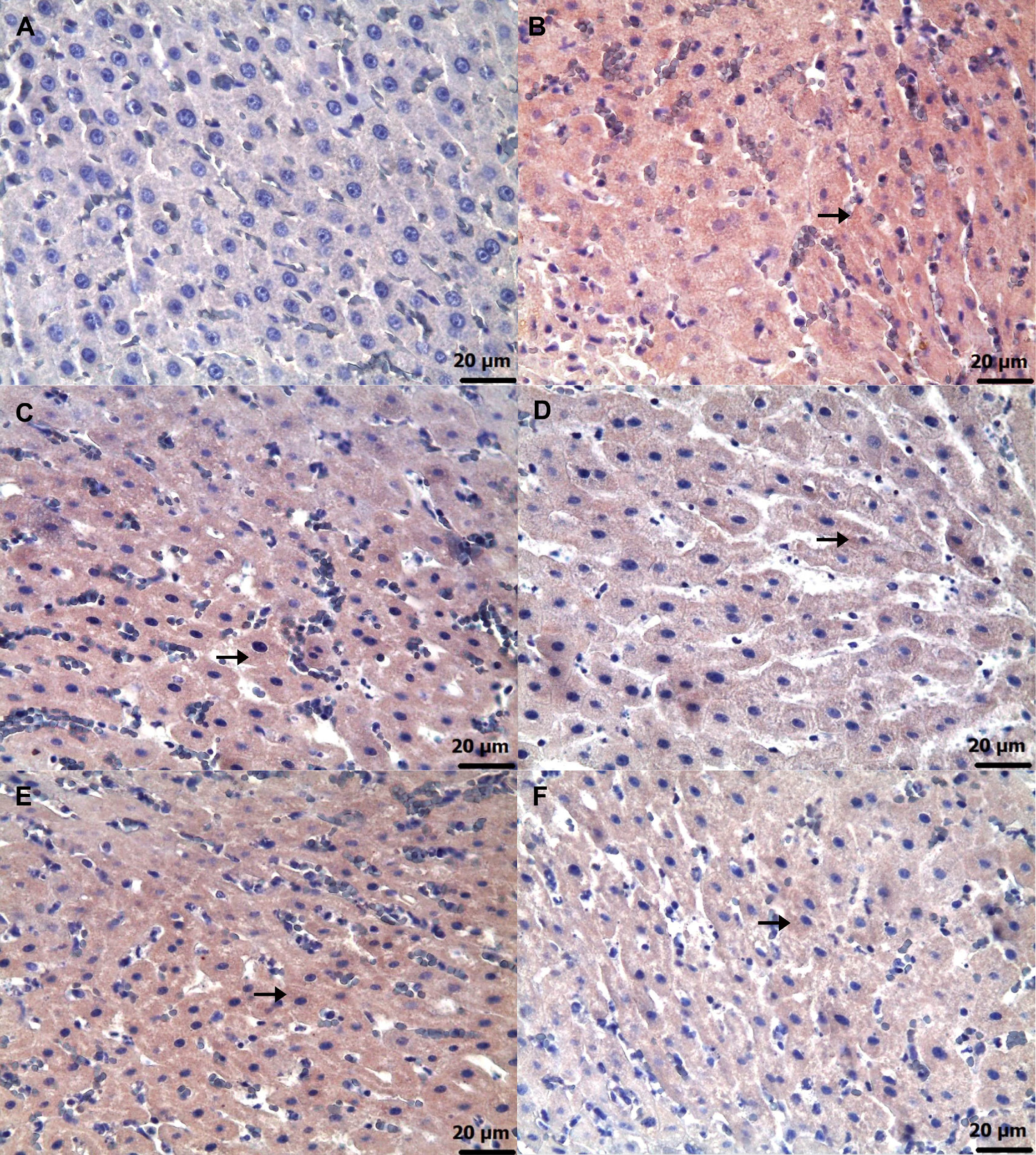 The MDA levels in liver tissue were higher in the amiodarone-treated group than in the healthy group, as shown in Figure 1 and Table 1, Table 2. The difference in the levels of MDA in the liver tissue between the healthy group and the group treated with amiodarone was statistically significant. In addition, ATP 2 mg/kg and 5 mg/kg, resveratrol, and resveratrol + ATP 2 mg/kg treatment significantly suppressed the amiodarone-induced rise in MDA levels in liver tissue. In the groups treated with ATP 2 mg/kg and resveratrol, a statistically significant difference in MDA levels was found in the liver tissues compared to the healthy group. However, the difference in MDA levels between the healthy group and the groups treated with ATP 5 mg/kg and resveratrol + ATP 2 mg/kg was not statistically significant.