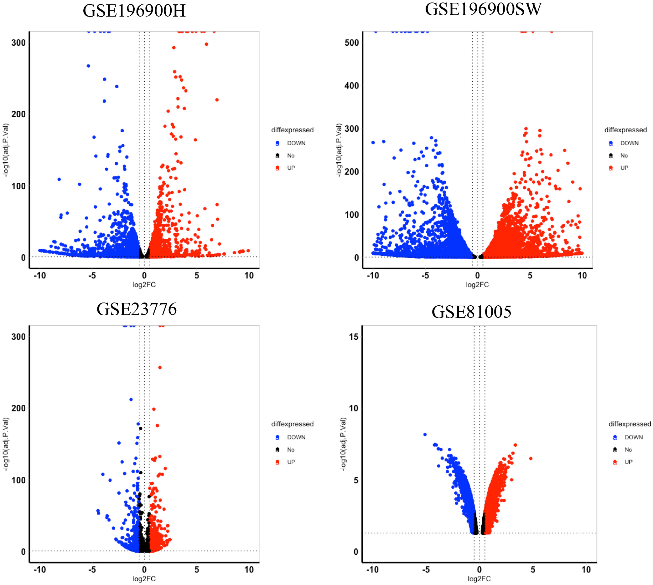 Differentially expressed genes (DEGs) were identified from microarray datasets using GEO2R (https://www.ncbi.nlm.nih.gov/geo/geo2r) and from RNA-seq data via the Galaxy platform (https://usegalaxy.org).12 Genes meeting the criteria of an adjusted p-value < 0.05 and |log2 fold change| > 0.5 were considered significant. Data visualization, including volcano plots and Venn diagrams, was performed in RStudio (https://rstudio.com) and with the jvenn online tool (https://jvenn.toulouse.inrae.fr/app/index.html), respectively.