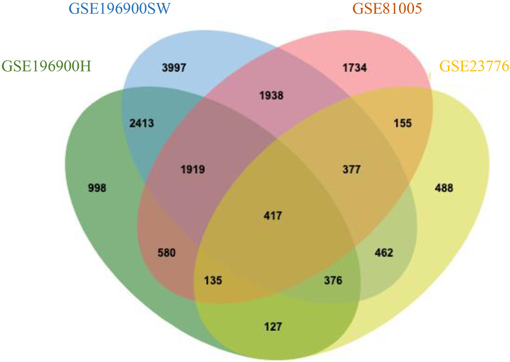 Volcano plots (Figure 1) depict the distribution of significantly up- and downregulated genes in each 5-FU-resistant colorectal cancer model. By intersecting the DEG lists from all 4 datasets with a Venn diagram, we identified 417 genes that were consistently dysregulated across these resistant cell lines (Figure 2). The complete breakdown of upregulated vs downregulated DEGs for each dataset is presented in Table 2.