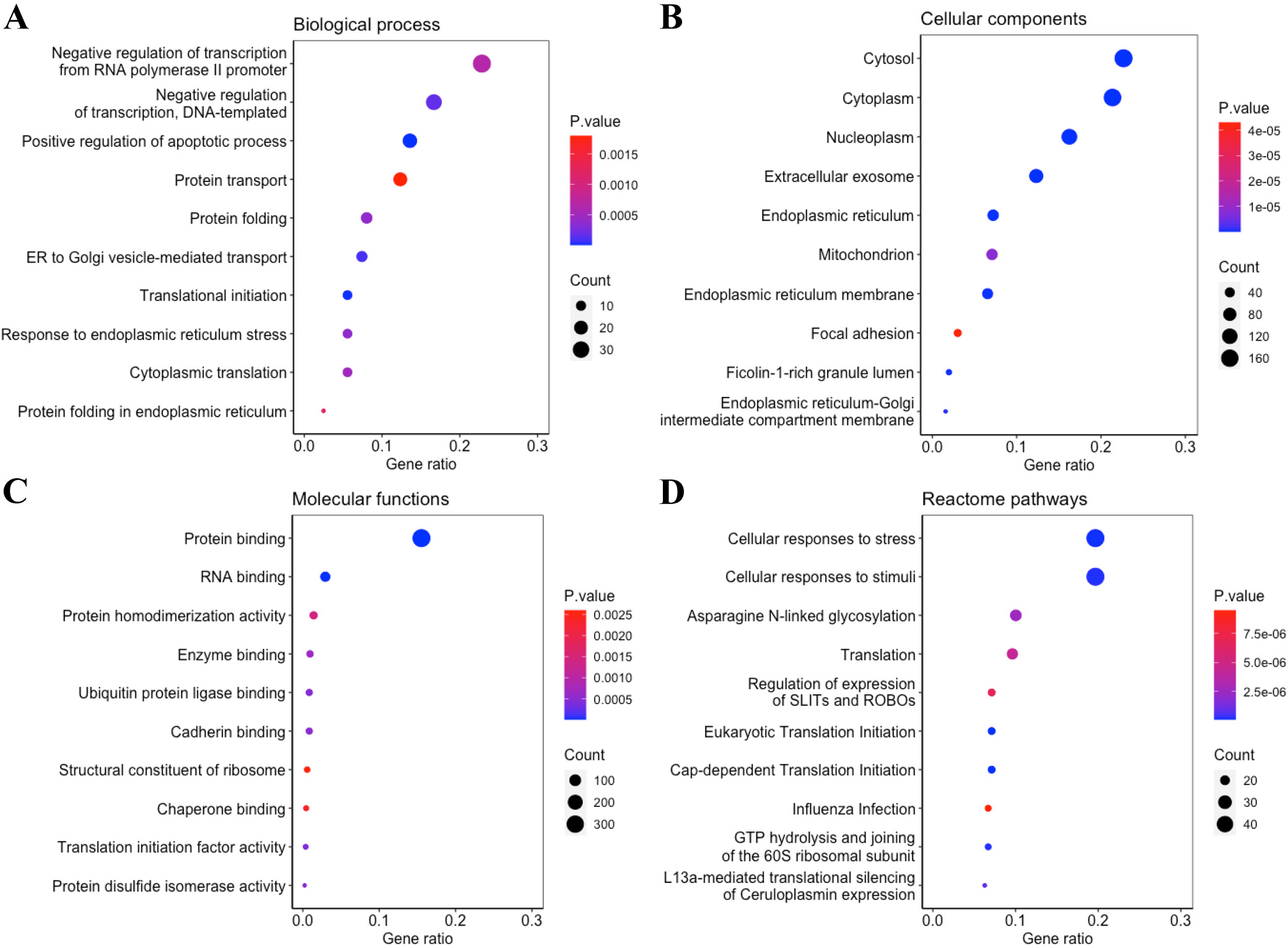 Gene Ontology analysis of the 417 DEGs common to all 4 5-FU-resistant cell lines revealed significant enrichment in biological processes such as negative regulation of transcription from the RNA polymerase II promoter (Figure 3A). At the cellular-component level, these genes localized predominantly to the cytosol and nucleoplasm (Figure 3B). Molecular-function analysis showed a strong bias toward protein and RNA binding activities (Figure 3C). Reactome pathway enrichment further indicated that these DEGs participate broadly in the cellular response to stress and external stimuli, glycosylation processes, and protein translation (Figure 3D).