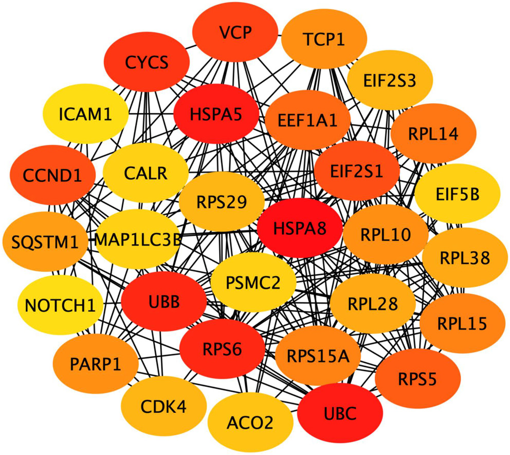 The PPIs of 417 common DEGs associated with 5-FU resistance were constructed using STRING. From the PPIs network, the hub genes were identified and ranked as the top 30 hub genes according to their connectivity (binding scores) with other genes (Table 3). The top 10 hub genes included HSPA8, UBC, HSPA5, UBB, RPS6, CYCS, VCP, EIF2S1, CCND1, RPS5. Node colors reflect the connectivity degree, with a pseudocolor scale ranging from red to yellow, representing gene rankings from 1 to 30 (Figure 4).