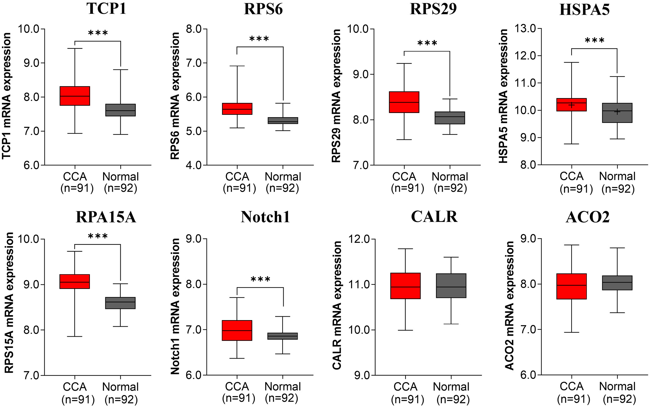 To validate the relevance of the 8 upregulated hub genes in cholangiocarcinoma, we examined their expression in Thai CCA patient tissues using GEO dataset GSE7631.17 Six genes – TCP1 (M–W U = –7.335, p < 0.001), RPS6 (U = –8.521, p < 0.001), RPS29 (U = –7.527, p < 0.001), RPS15A (U = –9.657, p < 0.001), NOTCH1 (U = –3.254, p = 0.001), and HSPA5 (t(181) = 3.505, p = 0.001) – were significantly overexpressed in tumor vs adjacent normal tissues (Figure 6). Detailed summary statistics (median ±IQR for nonparametric tests; mean ±95% CI for parametric tests) are provided in Supplementary Table 2.