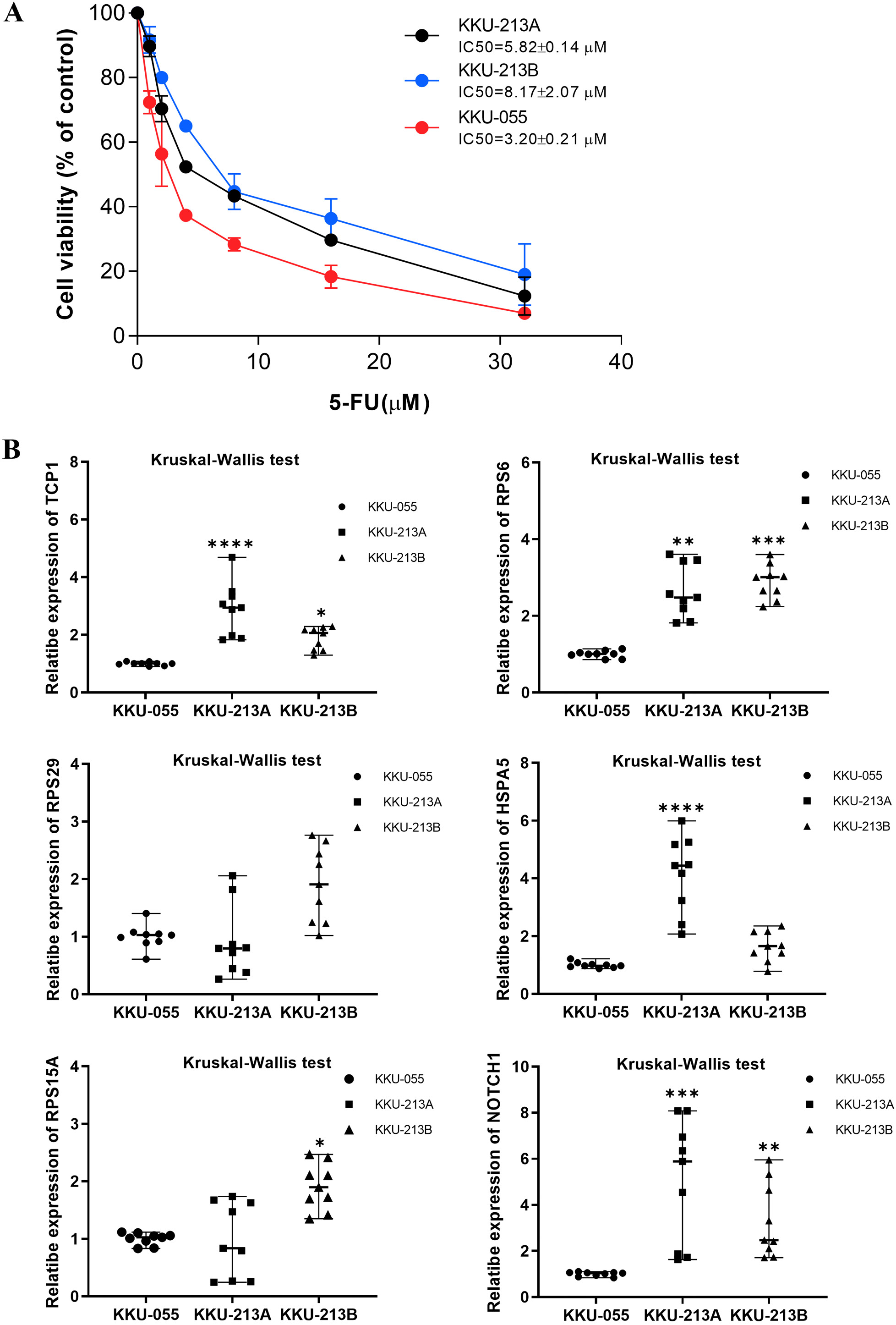 Real-time PCR analysis of the 6 upregulated hub genes in CCA cell lines revealed that, of these candidates, TCP1 (Kruskal–Wallis H = 19.65, p < 0.001), RPS6 (H = 19.65, p < 0.001), and NOTCH1 (H = 17.92, p < 0.001) were significantly more abundant in the 5-FU-insensitive lines (KKU-213A and KKU-213B) than in the 5-FU-sensitive line (KKU-055) (Figure 7B). Median expression values with interquartile ranges for all 6 genes are provided in Supplementary Table 4.