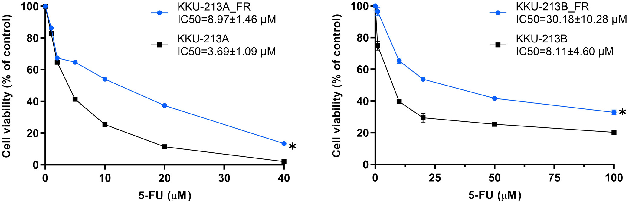 To further validate the link between mRNA expression of the 6 hub genes and 5-FU resistance, we compared parental CCA cell lines (KKU-213A, KKU-213B) with their 5-FU-resistant counterparts (KKU-213A-FR, KKU-213B-FR). As anticipated, the resistant sublines exhibited significantly reduced sensitivity to 5-FU vs their parental lines, as shown by Wilcoxon matched-pairs signed-rank tests (KKU-213A vs KKU-213A-FR: Z = –2.366, p = 0.018; KKU-213B vs KKU-213B-FR: Z = –2.201, p = 0.028) (Figure 8).