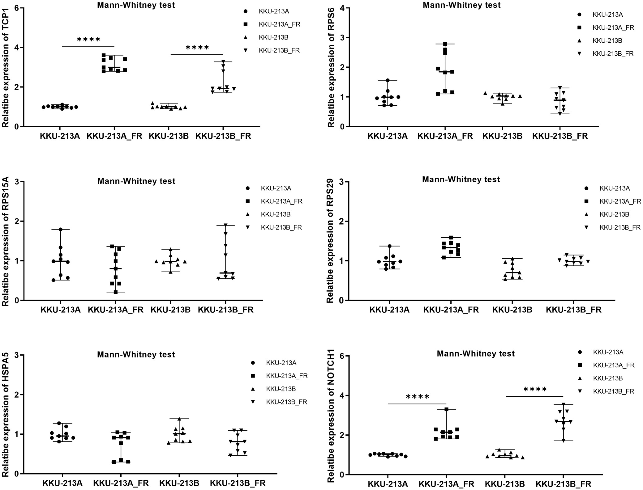 Consistent with our earlier findings, TCP1 and NOTCH1 mRNA levels were markedly higher in the 5-FU-resistant sublines than in their parental counterparts. Specifically, TCP1 expression was significantly elevated in KKU-213A-FR vs KKU-213A (M–W U: Z = –3.576, p < 0.001) and in KKU-213B-FR vs KKU-213B (Z = –3.582, p < 0.001). Similarly, NOTCH1 levels were substantially increased in KKU-213A-FR compared to KKU-213A (Z = –3.580, p < 0.001) and in KKU-213B-FR compared to KKU-213B (Z = –3.576, p < 0.001) (Figure 9). Median values with interquartile ranges (IQR) are detailed in Supplementary Table 5.