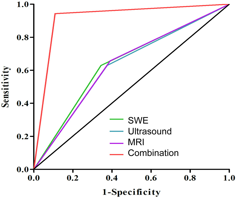 Figure 4 demonstrates the ROC of each modality as well as the combination of 3 techniques. The AUC values were as follows: SWE (0.642), ultrasound (0.627), MRI (0.633), and the combination of all 3 modalities (0.917). Pairwise comparisons using DeLong’s test showed that the AUC for the combined modalities was significantly higher than those for individual modality (padjusted < 0.001). However, no significant differences were observed between SWE, ultrasound and MRI (padjusted > 0.05 for all comparisons) (Table 7).