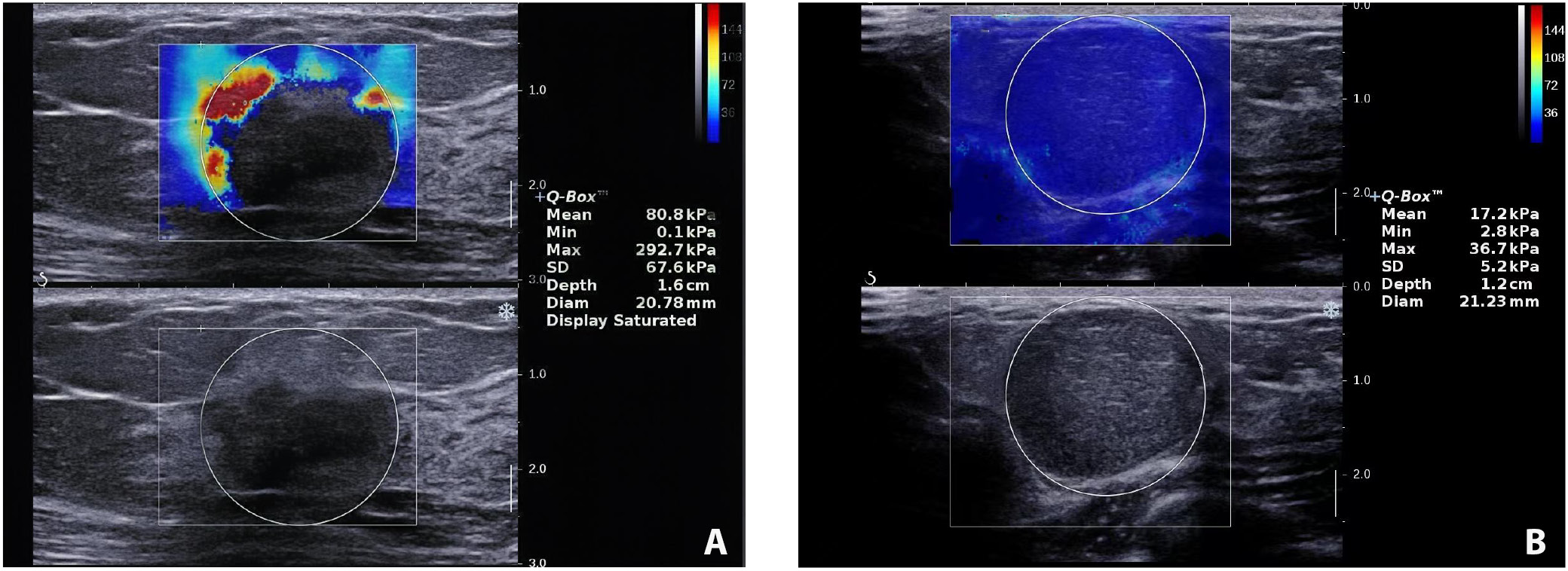 Besides the diagnostic value of SWE, its capability to be integrated in breast cancer prognosis prediction has also been investigated. Higher E-ratio has been reported to be associated with negative hormonal receptor expression and positive p53 and Ki-67.41 Chang et al. studied 337 patients with invasive breast cancer and found that elevated elastic parameters were significantly associated with more aggressive tumor subtypes.42 Another research group reported similar findings and additionally observed that high tissue elasticity was associated with nodal metastases.43 Furthermore, a growing body of evidence supports the use of SWE in predicting responses to neoadjuvant chemotherapy.25, 44, 45 While these aspects were beyond the scope of our study, the encouraging results underscore the prognostic potential of SWE and its possible role in informing future treatment strategies for patients with breast cancer.