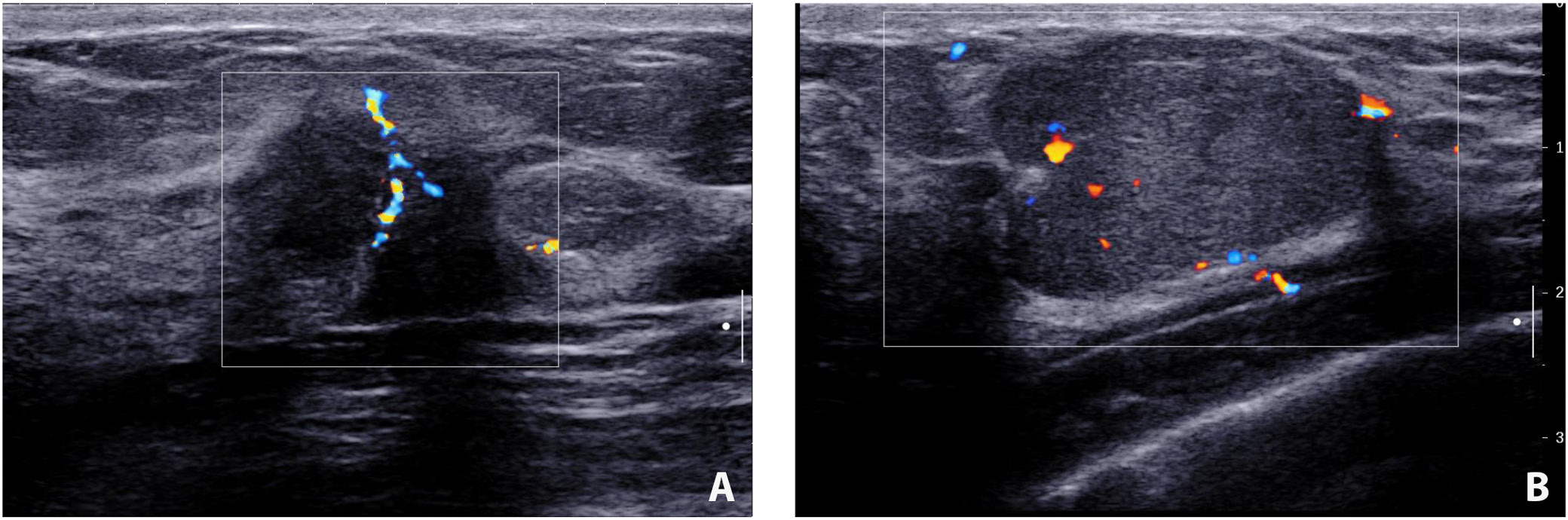 The incidence of discovering a mass in the malignant cohort was higher than that in the benign group (37.1% vs 14.1%; χ2 = 6.97, df = 1, p = 0.008). It is also more likely to detect heterogeneous echogenicity in malignant lesions (45.7% vs 15.6%; χ2 = 10.58, df = 1, p = 0.001). Benign lesions tended to have well-defined borders (χ2 = 19.92, df = 1, p < 0.001) and regular shapes (χ2 = 11.25, df = 1, p = 0.001). Calcifications were more frequently detected in patients with malignant diseases (χ2 = 6.24, df = 1, p = 0.013). There was a higher proportion of malignant lesions showing posterior attenuation (42.9% vs 21.9%; χ2 = 4.81, df = 1, p = 0.028). Benign lesions were less likely to be associated with abnormal axillary node findings (76.6% vs 34.3%; χ2 = 17.01, df = 1, p < 0.001) (Table 3). The typical ultrasound images from the malignant and benign groups are shown in Figure 2.