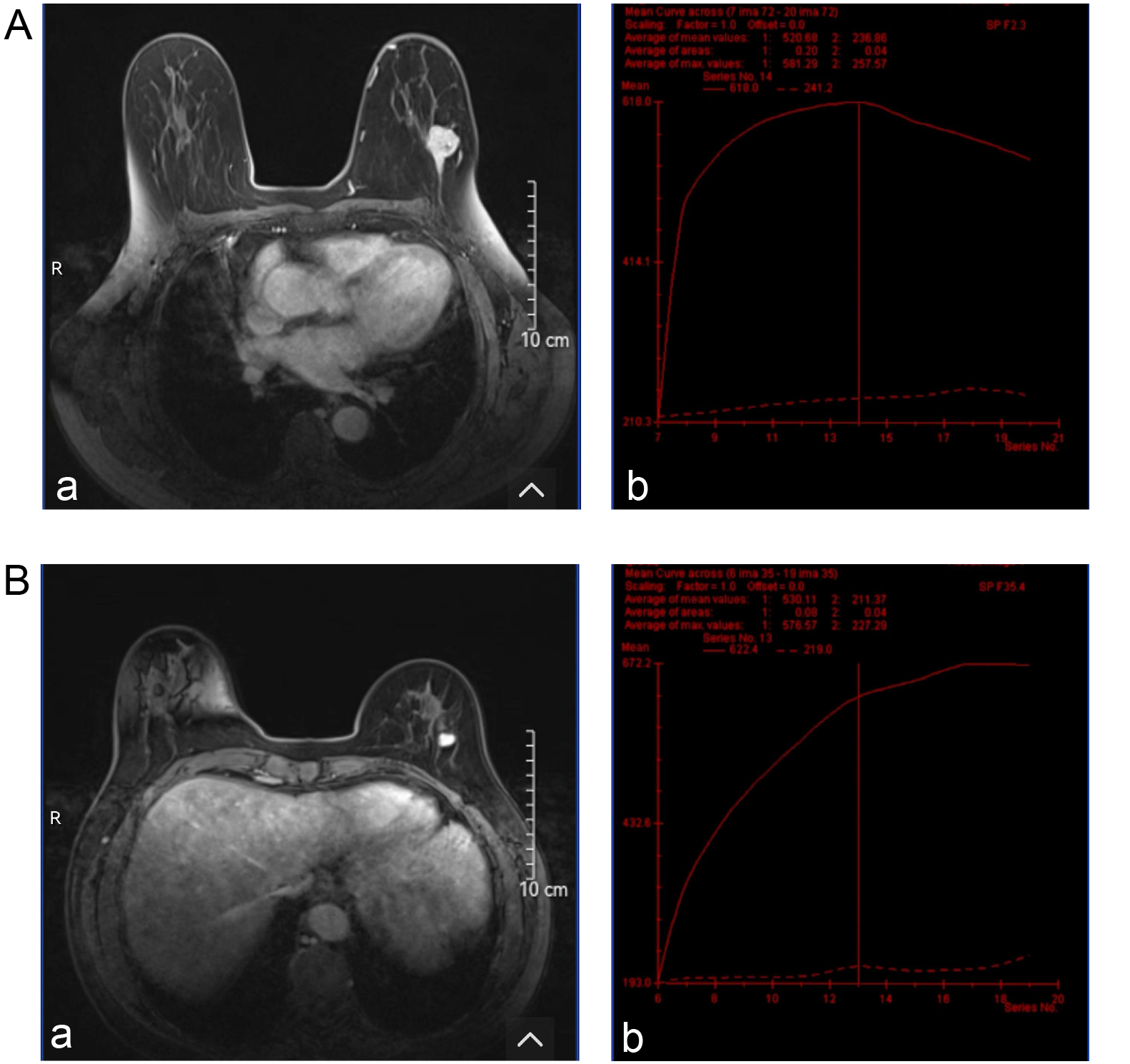 Pre-menopausal patients underwent breast MRI using a 3.0T MRI machine (MAGNETOM Skyra; Siemens AG, Erlangen, Germany) during the 7th to 14th day of their menstrual cycle. No time restrictions applied to post-menopausal patients. The patient was placed in a prone position, and the breasts were appropriately positioned using a dedicated 4-channel coil. Non-enhanced studies included continuous axial slices (thickness: 3 mm, distance factor = 0), and T1-weighted images were captured using turbo spin-echo sequences, while T2-weighted fat-saturated images were obtained via short tau inversion recovery sequences. Dynamic contrast-enhanced studies used three-dimensional (3D) T1-weighted gradient-echo sequences with the following parameters: repetition time (TR)/echo time (TE): 4.66/1.68 ms; matrix: 448 × 362; field of view. Gadoteric acid was intravenously injected at a dose of 0.2 mL/kg, followed by a 15 mL saline flush. The post-contrast imaging was repeated 5 times. Image processing included subtraction (obtained by subtracting pre-contrast images from the 5 sets of post-contrast images on a pixel-by-pixel basis), multi-planar reconstruction, maximum intensity projection, and time-intensity curves (TIC). The size, shape, border, intensity, and enhancement on the MRI imaging were documented.