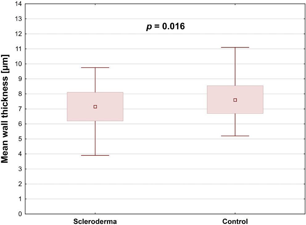 The study included 31 SSc patients (61 eyes) and 41 healthy controls (81 eyes). No significant differences between the 2 groups regarding retinal arteries TD, LD, second wall thickness, and WCSA were found (Table 4). Mean retinal arterial wall thickness was significantly lower in SSc patients than in healthy controls (p = 0.016), and the wall-to-lumen ratio was also notably decreased in the SSc group (p = 0.048) (Table 4; Figure 3, Figure 4).