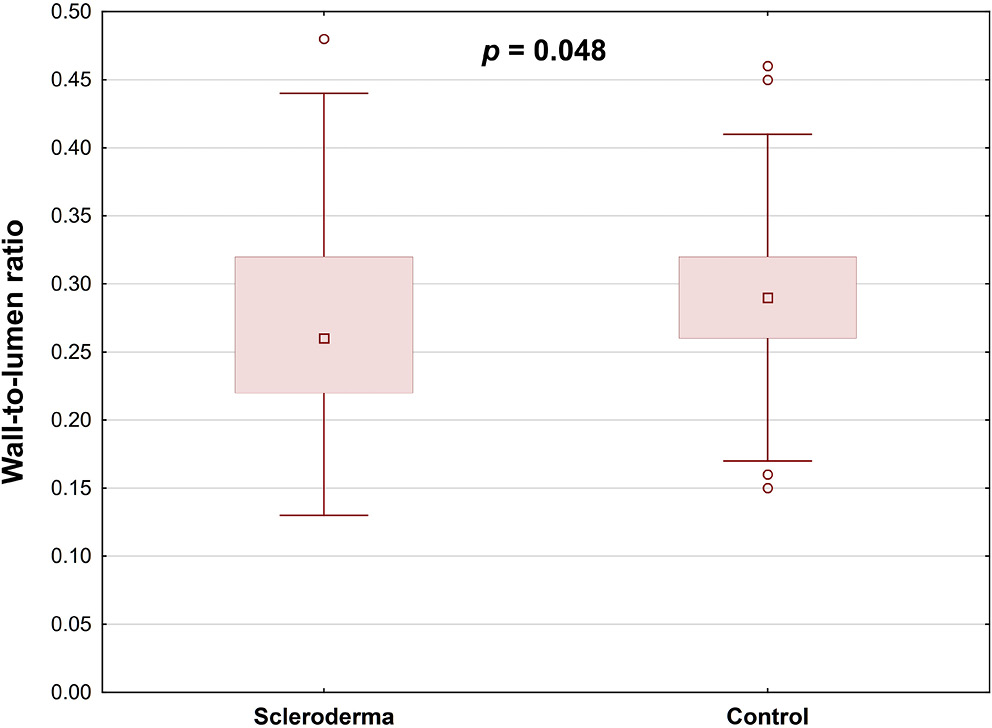 An elevated WLR reflects both thickening of the vessel wall and concomitant narrowing of the lumen. Piantoni et al.36 used AO in patients with active rheumatoid arthritis treated with abatacept to evaluate cardiovascular risk factors. Their results indicated a significant reduction in the WLR of the arterioles after abatacept treatment. However, our results showed that the mean arterial wall was thinner in the scleroderma group than in the controls (p = 0.016). It is possible that the observed results may be attributed to the vasodilator treatment employed in the management of SSc.37