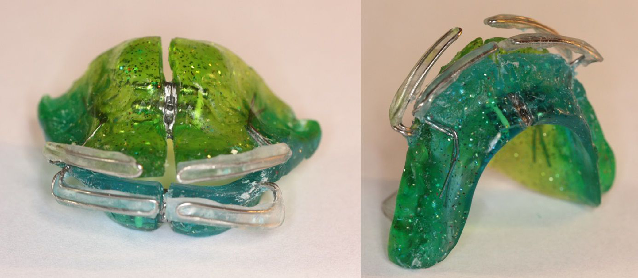 The orthodontic ERCO appliance (Figure 1) was created according to the design and treatment indications of the first author (Z.P.). The functional appliance was formed using a construction bite with a minimum vertical distance between the upper and lower dental arches (i.e., with the lack of contact of antagonistic teeth). In the sagittal dimension, occlusion was established by bringing upper and lower dental arches close to each other by a maximum of 1 premolar width. In the lateral position, the lower dental arch was placed so as to bring it closer to the mid-sagittal plane. The vertical zone separating the dental arches was filled with acrylic, which could be removed by the clinician. The appliance had 2 active elements, i.e., upper and lower screws, activated once a week. During treatment, the appliance was loosely fitted in the mouth.
