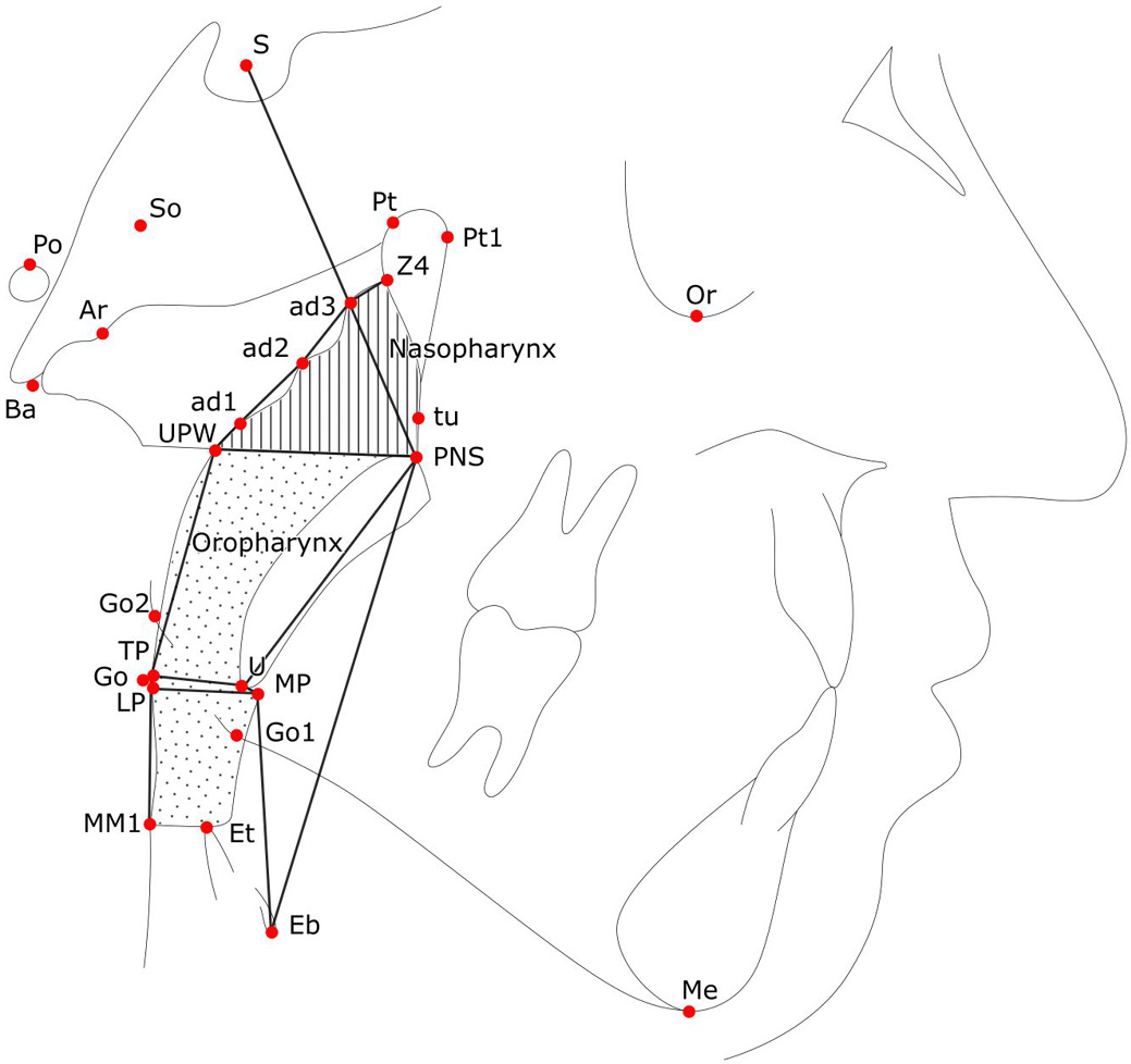 Furthermore, in our study, the division of the treatment and control groups according to skeletal classifications (regarding the anteroposterior relationship between the maxilla and mandible) was not implemented. Mislik et al. found only a few weak correlations between the “p” distance (the shortest distance between the soft palate and the posterior pharyngeal wall) and the “t” distance (the shortest distance between the tongue and the posterior pharyngeal wall) to various cephalometric landmarks with no significant correlations to the angle of the mandible or skeletal class.39 Additionally, Alves et al. reported no significant correlations between the ANB (the cephalometric parameter of choice for assessing the anteroposterior relationship between the maxilla and mandible) angle (formed between the most concave point of the anterior maxilla, nasion, and the most concave point on mandibular symphysis) and pharyngeal linear and surface measurements.40 Nevertheless, since discrepancies in pharyngeal airway dimensions depending on the mandibular position have been observed, the implementation of skeletal classifications might have been valuable in interpreting the results.41