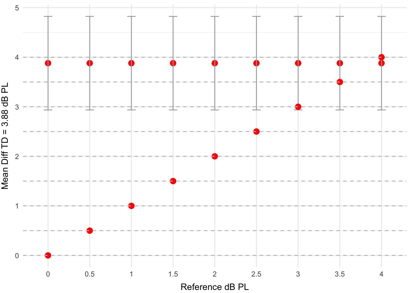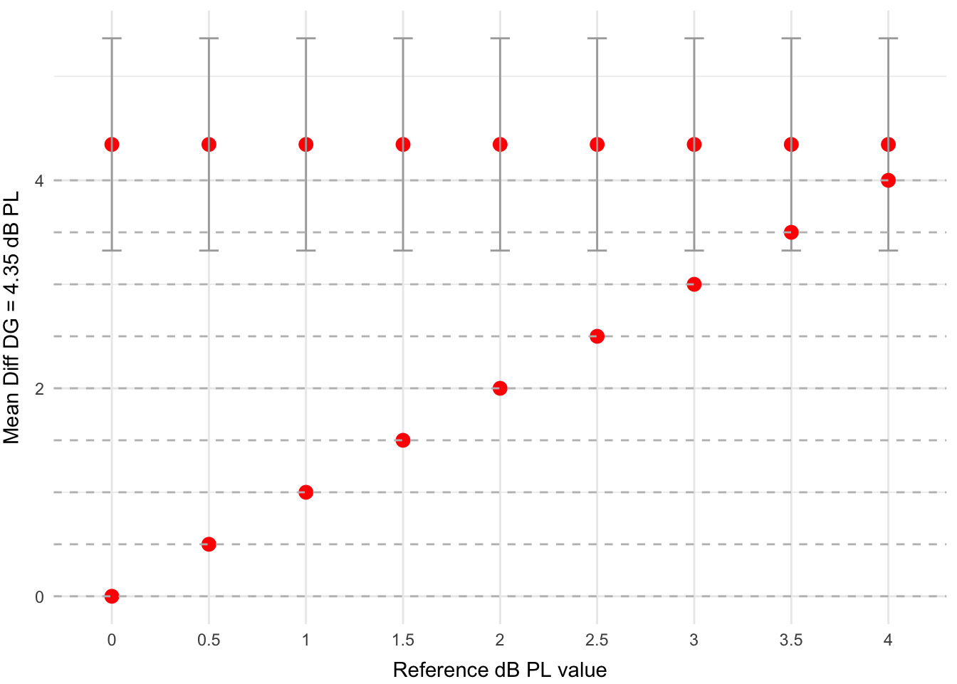 Similarly, for the phonemic opposition d:g, which had a mean amplitude of 4.34 dB PL, a significant difference was observed within the range of 0 to 2.5 dB PL (p = 0.010). These results are summarized in Table 3 and illustrated in Figure 2. The observed variability exceeds the commonly accepted threshold for test-retest reliability in speech recognition tasks, which is 2 dB for typically functioning listeners.14