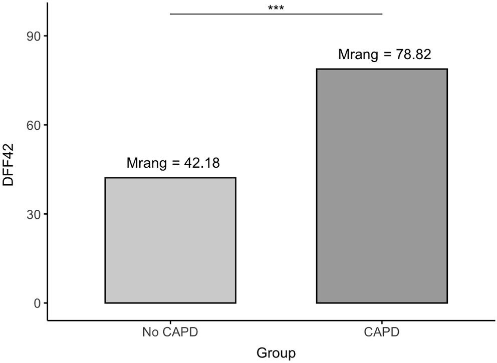 To assess significant differences between the 2 groups – children diagnosed with APD and children with excluded APD – a Mann–Whitney U test was performed. Despite the variances of the DFF42 measurements being equal across groups (F = 0.08; p = 0.772), the non-parametric test was chosen due to the failure to meet normality assumptions both overall and within the subgroups. The total sample size was n = 120, with 60 children in each group.