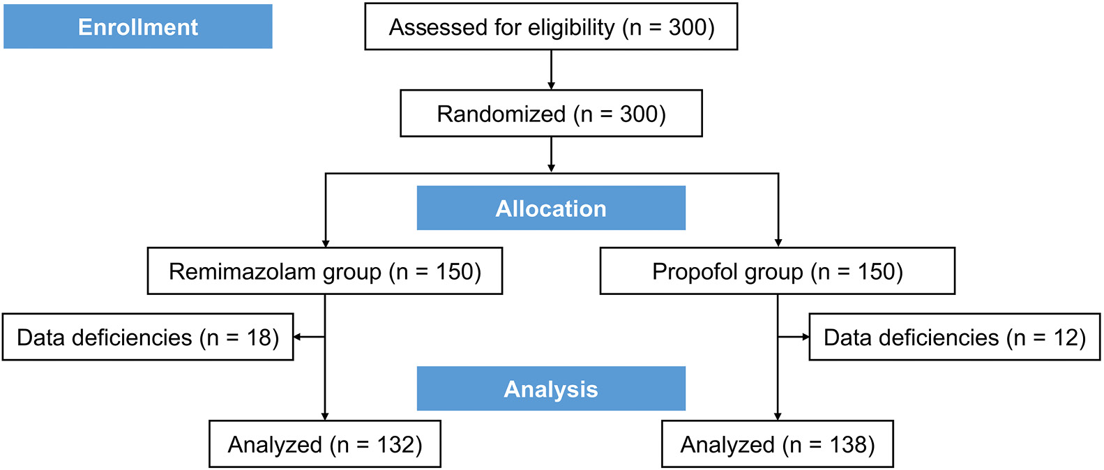 A total of 300 patients were enrolled, of whom 30 were excluded due to insufficient data (18 in the remimazolam group and 12 in the propofol group). Ultimately, 270 patients were included in the full analysis set, with 132 in the remimazolam group and 138 in the propofol group (Figure 1).