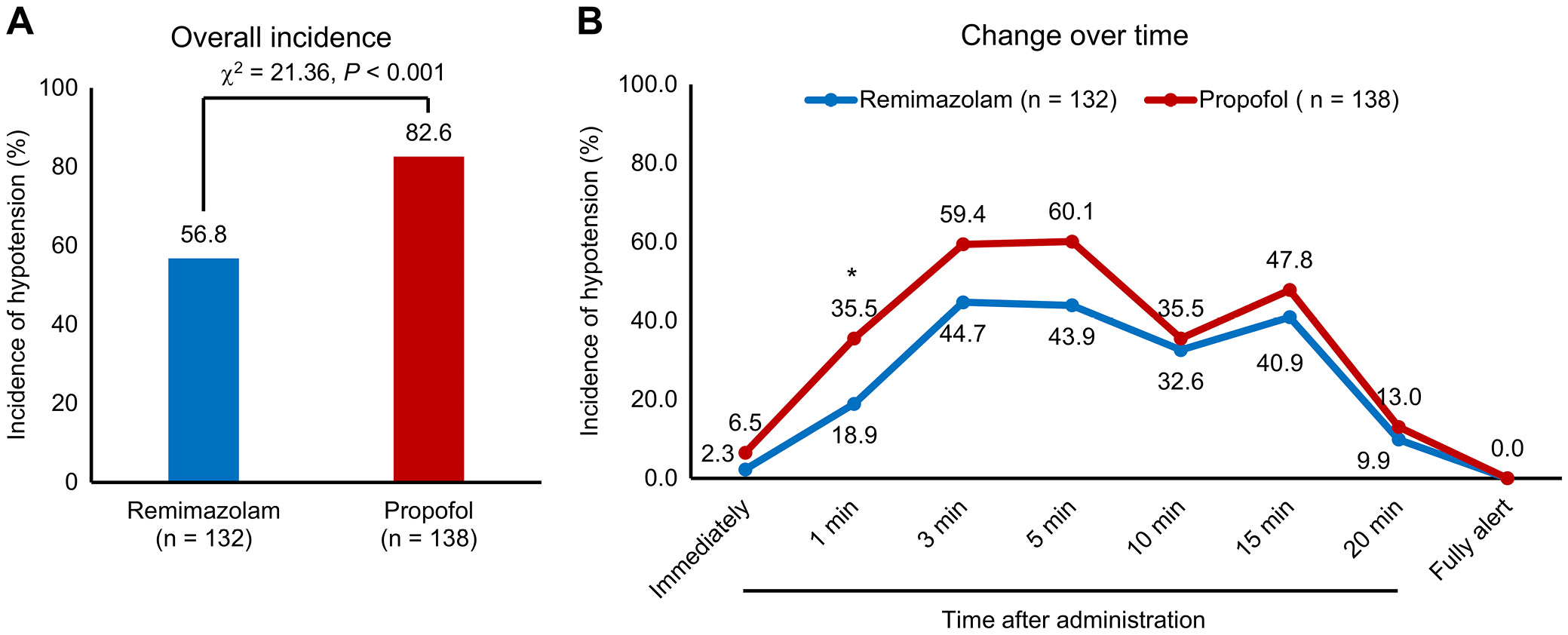In patients who received remimazolam, the incidence of intraoperative hypotension (75/132, 56.8%) was significantly lower compared with the propofol group (114/138, 82.6%) (p < 0.001) (Figure 2A). Additionally, from Figure 2B, it is evident that the incidence of intraoperative hypotensive events at 1, 3 and 5 min after remimazolam administration appeared to be lower than in the propofol group. There was no significant difference in the incidence of hypotensive events between the 2 groups from 10 min after sedation induction until awakening (Figure 2B).