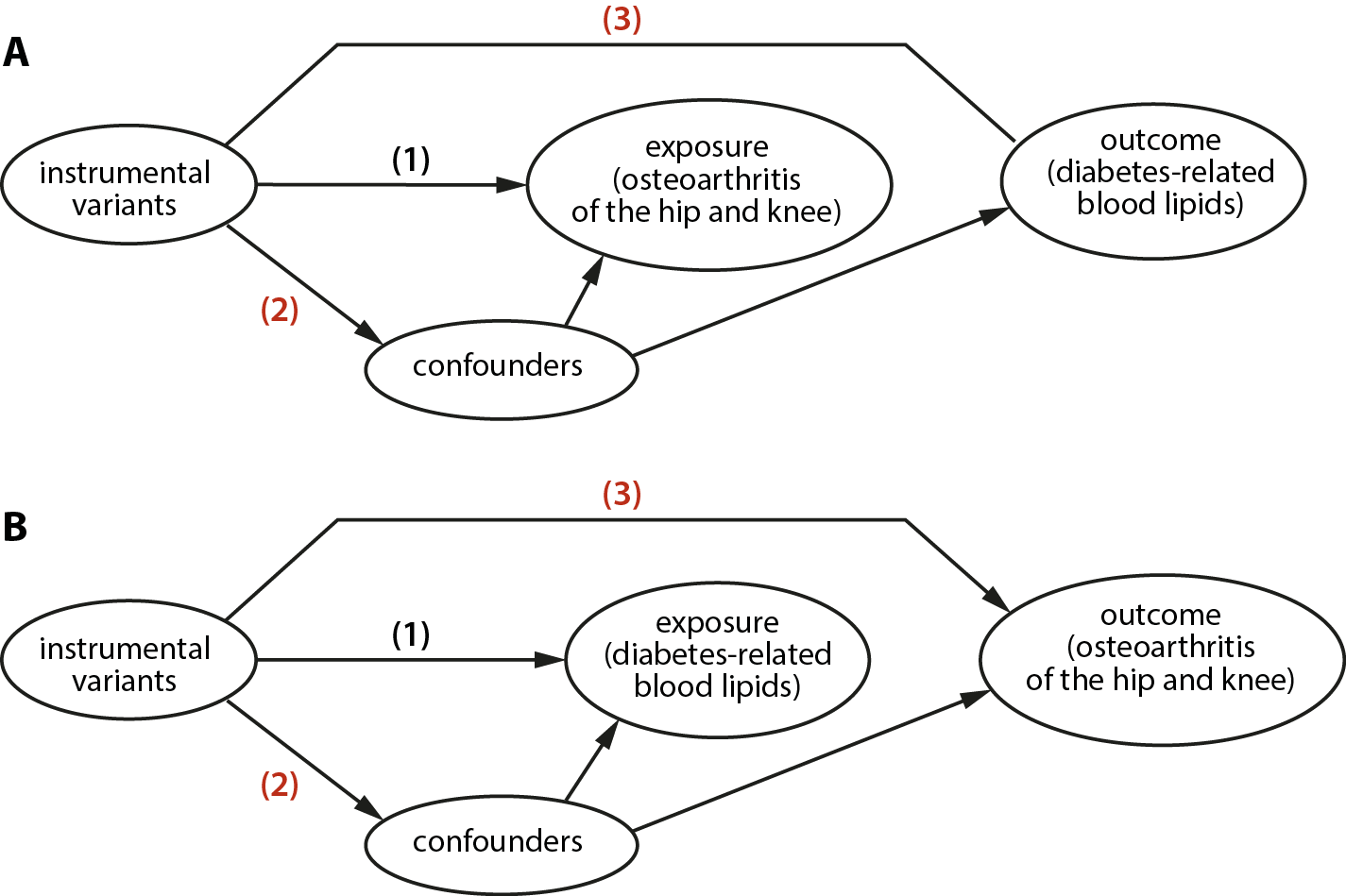 The MR analysis was conducted in 2 stages. In the 1st step, OA was treated as the exposure, and diabetes-related factors and blood lipid measures were treated as the outcomes. Methods such as inverse-variance weighted (IVW) were employed to test for causal relationships (Figure 1A). In the 2nd step, the process was reversed, with diabetes-related and blood lipid risk factors as exposures and OA as the outcome (Figure 1B).
