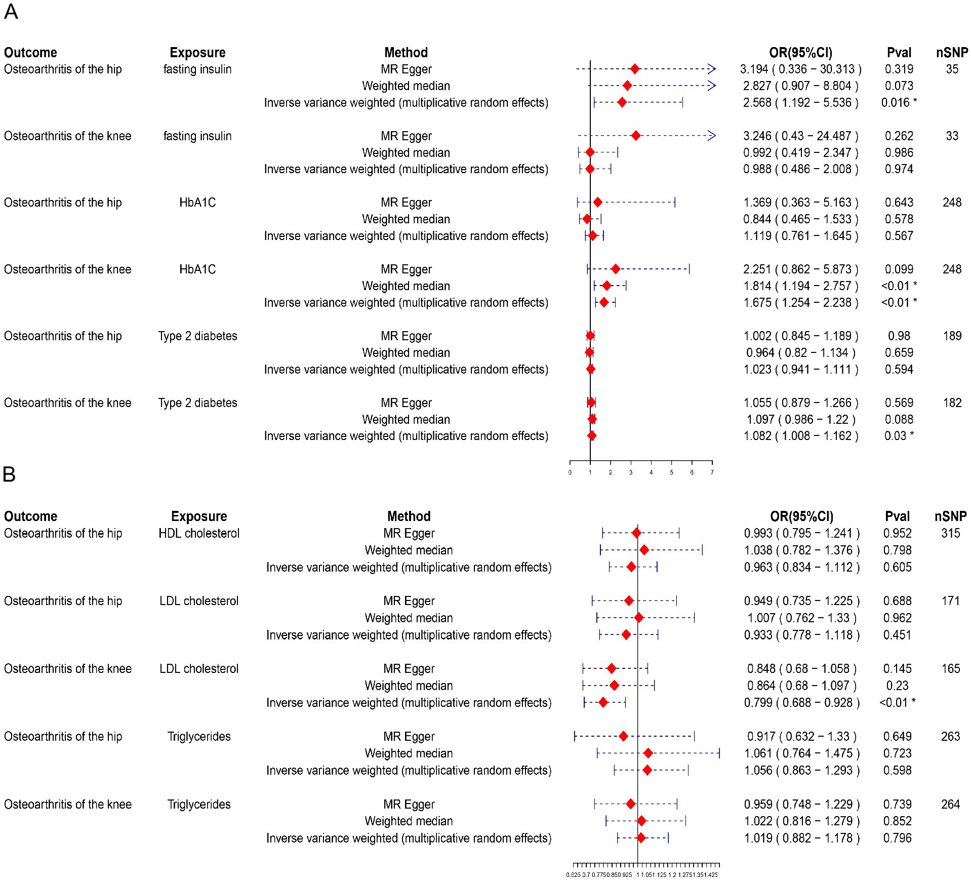 Conclusions. This study provides evidence supporting causal associations between diabetes-related factors, blood lipid levels, and the risk of KOA and HOA. These findings suggest that effective blood glucose control and lipid management may help prevent or slow the progression of OA.