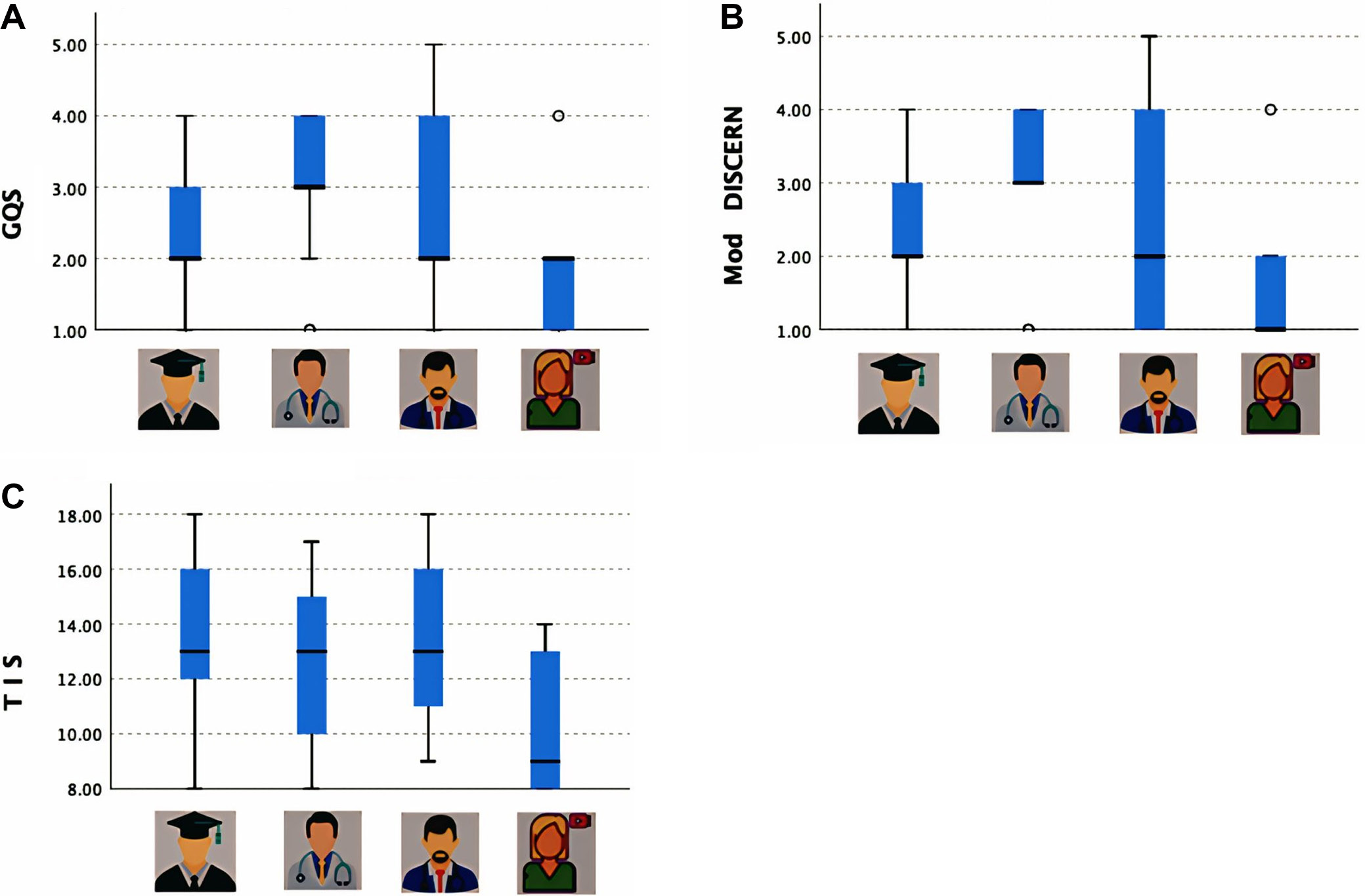 The median GQS scores were 2 (2–3), 3 (2.5–4), 2 (2–4), and 2 (1–2.5) for academicians, government hospital physicians, private hospital physicians, and non-physicians, respectively. The median modified DISCERN scores were 2 (2–3), 3 (3–4), 2 (1–4), and 1 (1–2.5) for these same groups. There was no statistically significant difference in GQS scores based on the source of upload (H(3, 100) = 5.66, p = 0.129) (Table 3, Figure 3A). However, a statistically significant difference was observed in modified DISCERN scores among the groups (H(3, 100) = 9.73, p = 0.021) (Table 3, Figure 3B).