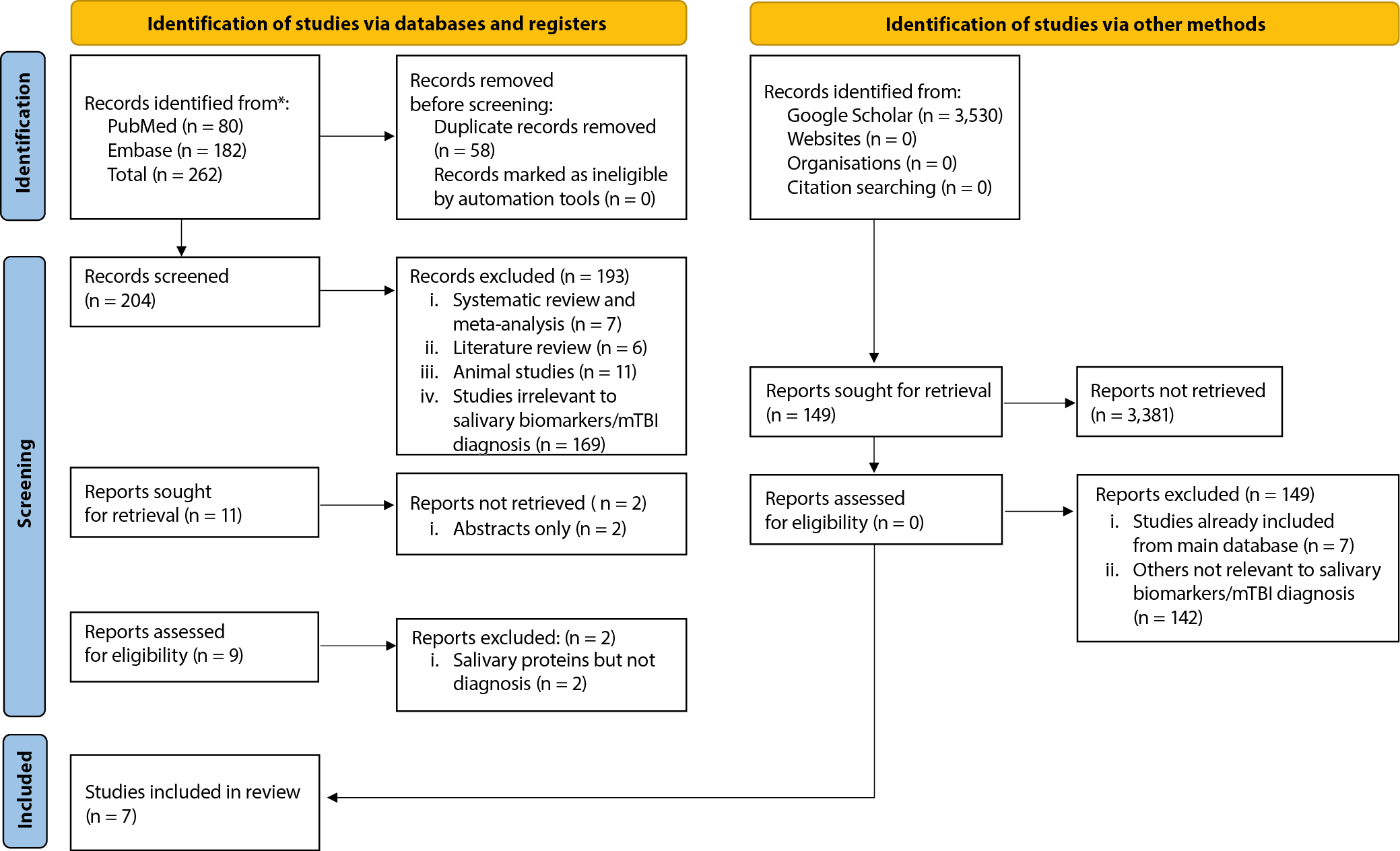 The process of screening and selection, as well as the inclusion and exclusion criteria of the studies, is detailed in the PRISMA flowchart (Figure 1). The initial search in PubMed and Embase resulted in 262 studies; title and abstract screening was conducted to exclude 58 duplicate studies. Studies that did not meet the inclusion criteria for the systematic review were also excluded, and 11 studies were retrieved for full-text screening. However, due to the unavailability of full texts, we further excluded 2 studies, and 2 additional studies were excluded during full-text screening as they investigated salivary proteins without evaluating their diagnostic utility. We also searched Google Scholar for grey literature, with the initial search yielding 3,530 studies. Of these, only 149 studies were retrieved, while the remaining studies were excluded because they were previous systematic reviews, meta-analyses, animal studies, or literature reviews. However, none of the 149 studies retrieved were eligible for inclusion, as they included already shortlisted studies or did not examine salivary protein biomarkers for mTBI identification. Finally, 7 (1.7%) of the 411 identified studies were selected for inclusion in our systematic review.10, 11, 12, 13, 14, 15, 16, 17, 18, 19, 20, 21, 22, 23, 24, 25, 26, 27, 28, 29, 30, 31, 32, 33, 34, 35, 36. These studies were assessed for risk of bias using the JBI checklist and were found to have a low risk of bias (Supplementary Table 2).