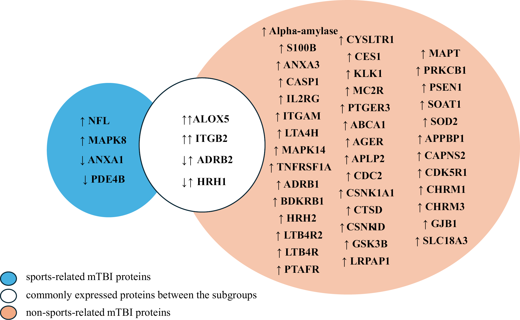 Comparative analysis of protein expression in 2 groups identified 4 proteins (ALOX5, ITGB2, ADRB2, and HRH1) commonly expressed in both groups. All 4 proteins exhibited differential expression in mTBI patients, with ALOX5 (FC: 253.9 ±140.72), ITGB2 (FC: 14.53 ±6.01), ADRB2 (FC: 25.14 ±10.25), and HRH1 (FC: 253.9 ±140.72) showing significant fold changes in non-sports-related cases. While ALOX5 and ITGB2 maintained upregulation across both groups, ADRB2 and HRH1 showed distinct trends, with significant downregulation observed in sports-related mTBI and upregulation in non-sports-related mTBI, which may suggest differences in protein expression based on the mechanism of injury.