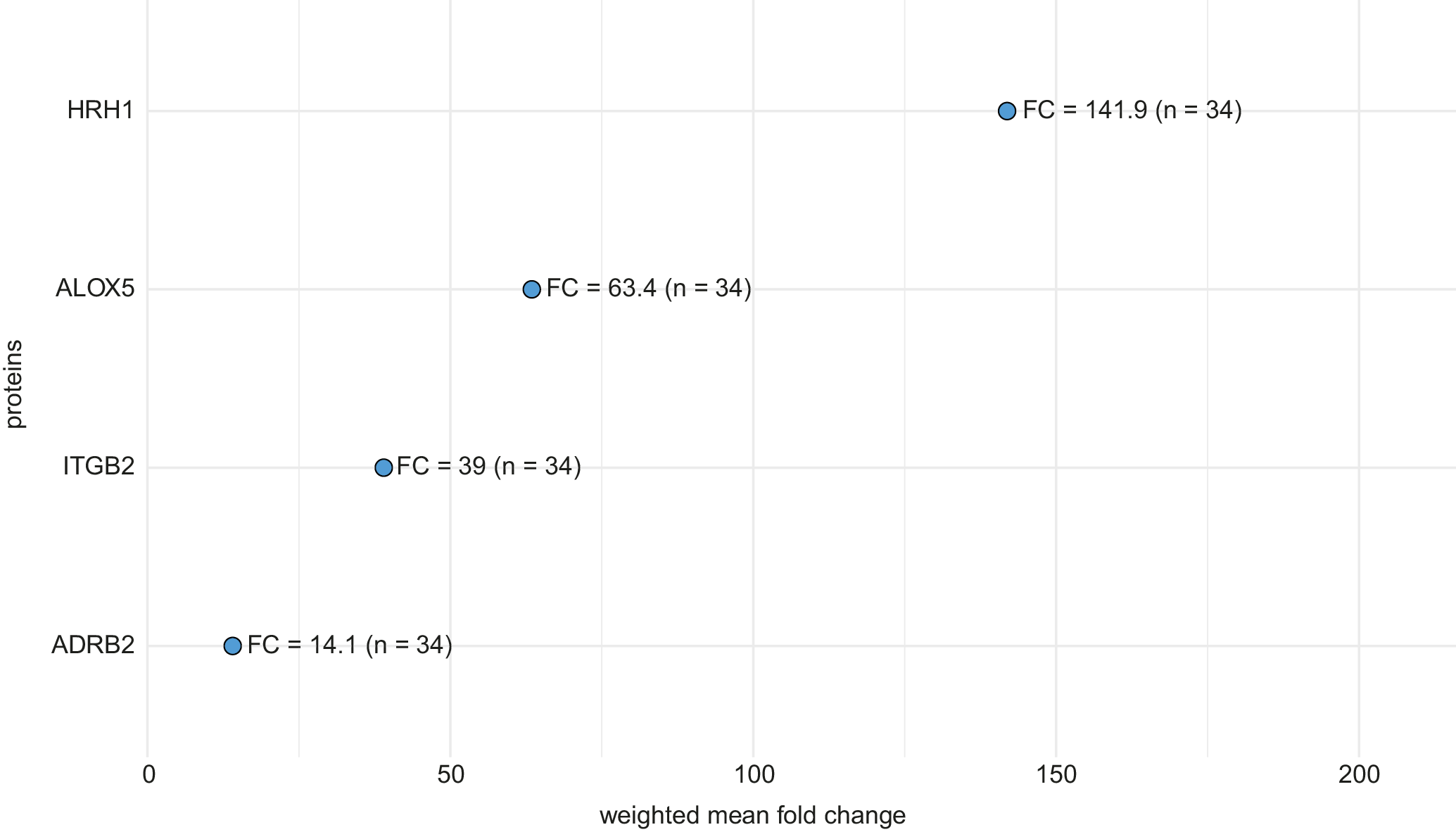 Weighted mean analysis of proteins reported in 2 studies32, 33 revealed HRH1 to exhibit the highest pooled upregulation (FC: 141.9), twice the expression level of the next highest protein, ALOX5 (FC: 63.4). ITGB2 also showed substantial upregulation (FC: 39.0), while the least upregulation was observed for ADRB2 (FC: 14.1). These values reflect pooled fold changes based on a total sample size of 34 participants (Figure 3).